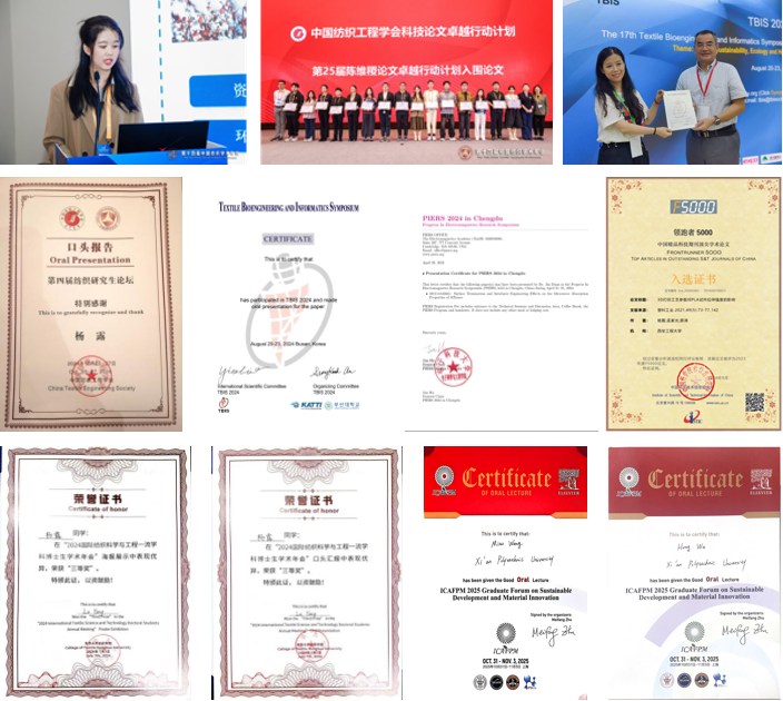 在学术科研方面,班级充分依托公司和公司提供的优质资源,研究生工作室配置科学合理。同学们在科研道路上互促共进,形成了良性竞争、追求卓越的学术氛围,多项创新成果发表于高水平国际期刊,屡获各类奖项。同学们踊跃参与国内外高水平学术会议,如TBIS 2024暨第17届纺织生物工程及信息国际会议、第十四届中国纺织学术年会以及第十二届先进纤维与聚合物材料国际会议等,并在会上作口头报告,与同行学者深入交流,拓展了学术视野。在学术成果上,班级同学展现出较强的科研实力,取得了丰硕成果。2024-2025年,班级同学以第一作者身份共发表高水平论文17篇,其中包括13篇SCI论文(一区9篇,二区3篇,三区1篇)、2篇EI论文以及2篇科技核心论文。在学术竞赛方面,班级同学积极参与并荣获省级奖项6项、校级奖项8项。在奖学金评选中,1名同学获得国家奖学金,1名同学获得桑麻特等奖学金。这些成绩不仅是个人努力的成果,更是班级良好学术氛围的有力体现。