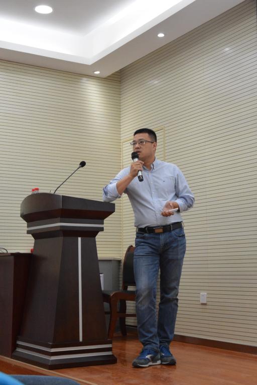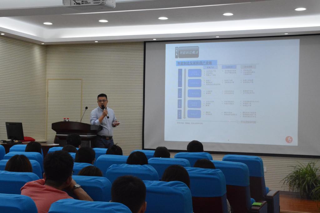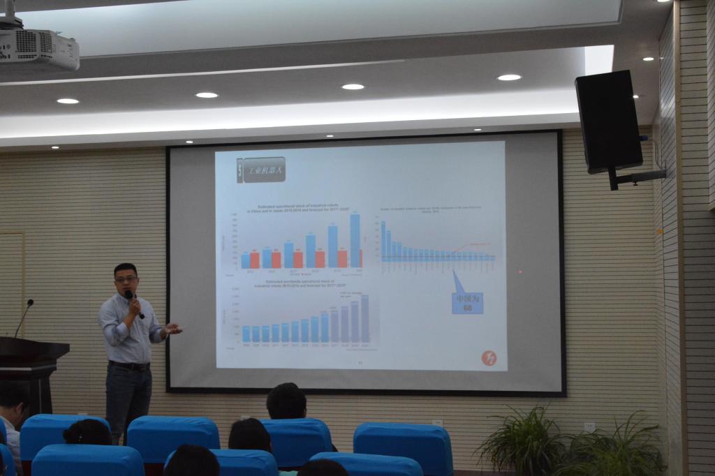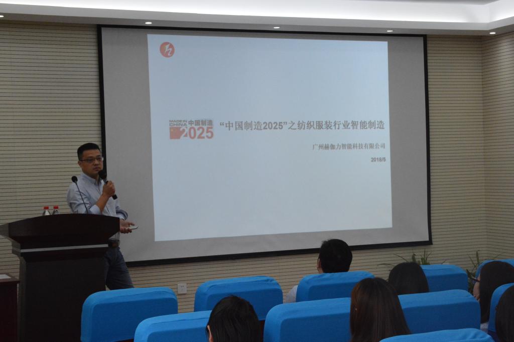 报告会上,徐博学长首先分享了再次回校的感受,漫步在校园回忆起很多美好的往事,并表达怀念在校度过的美好时光。之后,徐博学长通过个人简介、智能制造概述、汽车与纺织服装行业对比、纺织服装行业智能化现状、工业机器人、AGV(无人搬运车)、赫伽力产品七个方面进行了详细地讲述,接着,他通过视频让在座师生真实的感受到智能化在纺织服装行业中的应用,并表示智能化应用在纺织服装行业的转型升级中占有很大的空间和市场。