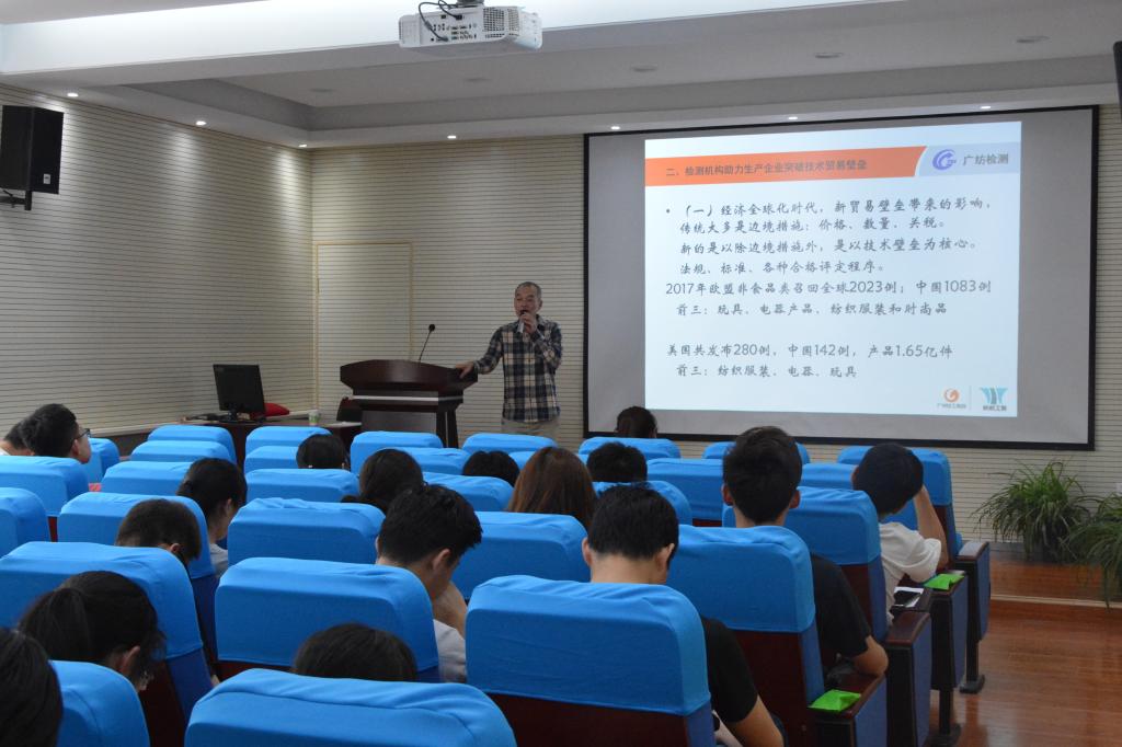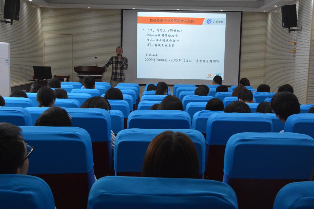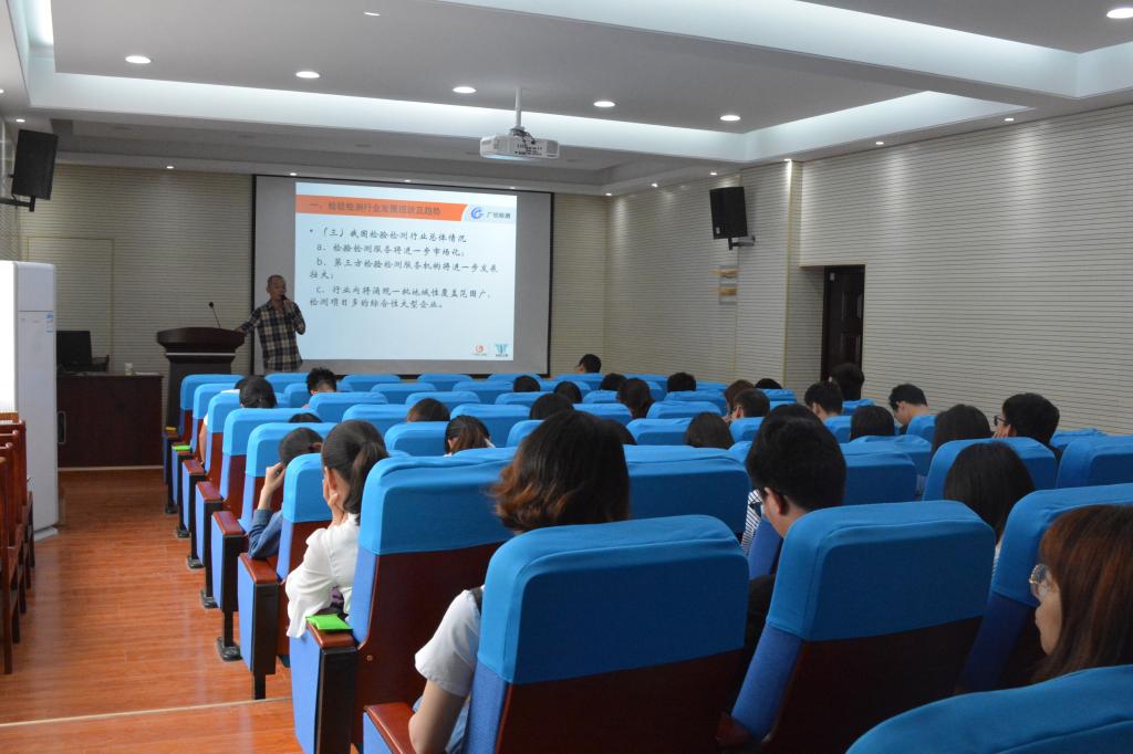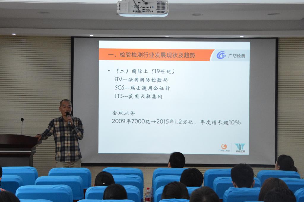 对于检验检测这个主题,吴穗生员工从检验检测行业发展现状及趋势、检测机构助力生产企业突破技术贸易壁垒、企业针对产品质量问题不断要采取的措施、纺织服装检验检测的概况和检验检测行业最大的问题五个方面对报告内容进行了详细地介绍,在介绍期间灵活地穿插实例让大家便于理解。最后给大家播放了广纺检测的宣传片,对他们公司的发展历程、服务对象及范围进行展示,同时欢迎本校员工加入他们。整场报告会气氛热烈,大大加深了同学们对检验检测行业的了解,拓宽了视野,也对求职择业有了新的理解和想法。