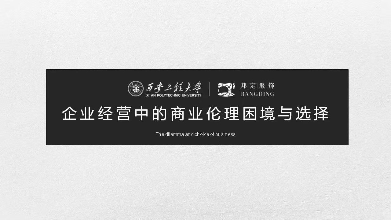 会上,作为公司管理公司“三全育人”导师团成员,肖海员工从自身经历谈起,回顾了自己在求学、创业和企业管理等人生重要阶段的经历,并聚焦其创办的西安邦定服饰有限公司,从商业伦理背景、合作双赢模式、“客户+员工+伙伴”几个具体方面,向大家分享了企业经营中的商业伦理问题与选择。