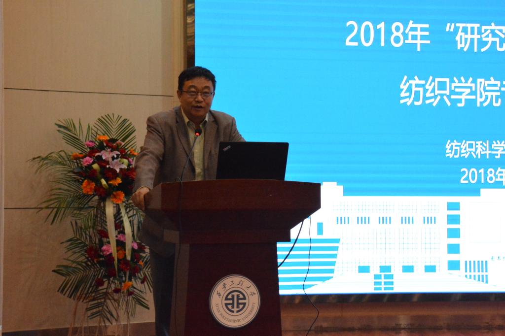 随后,纺织公司杨梅、申天伟、段喜莹和涂莉四位研究生同学分别进行学术分享报告。由孙润军教授指导的2016级高分子材料专业研究生杨梅以《静电纺壳聚糖/聚乙烯醇纳米纤维膜的制备和性能研究》为题,从静电纺丝原理及形成过程进行报告交流。由陆少峰副教授指导的2016级研究生申天伟以《低黄变柔性网状壳体微胶囊相变材料的制备》为题从相变材料起源、应用和制备方法三部分内容进行了报告交流。由邢建伟教授指导的2016级研究生段喜莹以《助剂XPN对Lannas型活性染料染色的影响》为题,围绕自主研发的匀染剂XPN对提高羊毛染色上染率问题进行了报告交流。由孟家光教授指导的2017级研究生涂莉以《废旧羊毛混纺面料的溶解回收》为题为何回收废旧羊毛混纺面料、如何回收和怎样再利用三方面进行交流汇报。互动提问环节,参会领导、老师和同学们分别结合四人学术报告内容从报告技巧、学术创新、解决实际问题等方面进行了提问和建议。