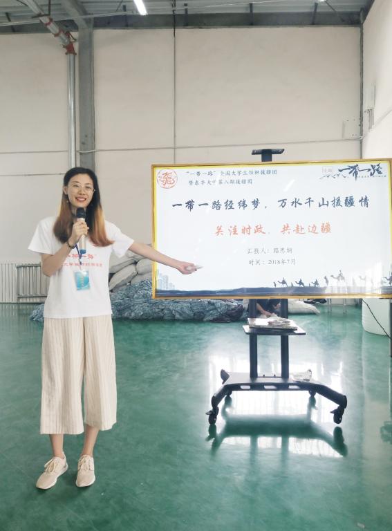 “衷心感谢以习近平同志为核心的党中央的亲切关怀”“学习贯彻党的十九大精神”的横幅在各个厂房内高高挂起,可以看出该集团对员工的思想保持先进性的重视,为此,实践团队决定以时政解读作为第一课。团队成员路思娴为员工们先后讲授了十九大精神、青岛峰会和一带一路政策、改革开放40周年。通过文字和资料,向员工们传达了新时代、新思想、新使命,并且运用大量图片展示了新疆在党的正确领导下近五十年来在交通、教育及纺织服装行业的发展和进步。在场的本地员工表示:近年来真真切切地体会到了新疆翻天覆地的改变,感恩党中央对新疆地区的关怀。现场多次响起如雷鸣般的掌声,透露出员工们对党中央领导的感恩及愿意永远追随党和国家的领导、响应国家和政策的号召的赤诚之心。