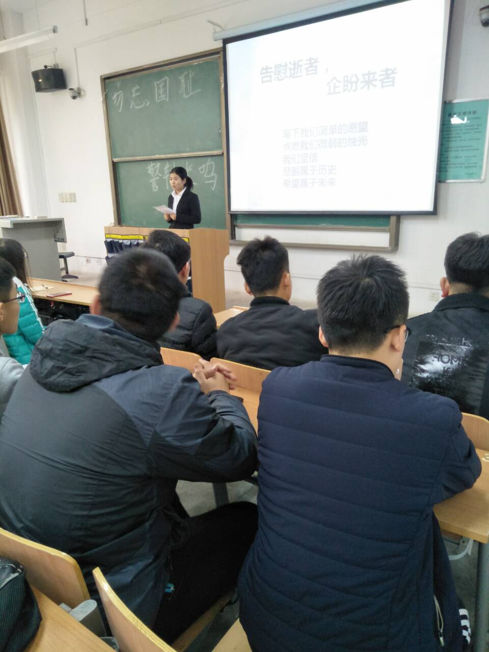 本次观看南京大屠杀死难者国家公祭日仪式直播,提高了同学们的历史使命感,提醒同学们要牢记历史,缅怀先驱,更要立足于当下,把个人理想与国家、民族目标相统一,为实现中华民族伟大复兴的中国梦而努力奋斗!