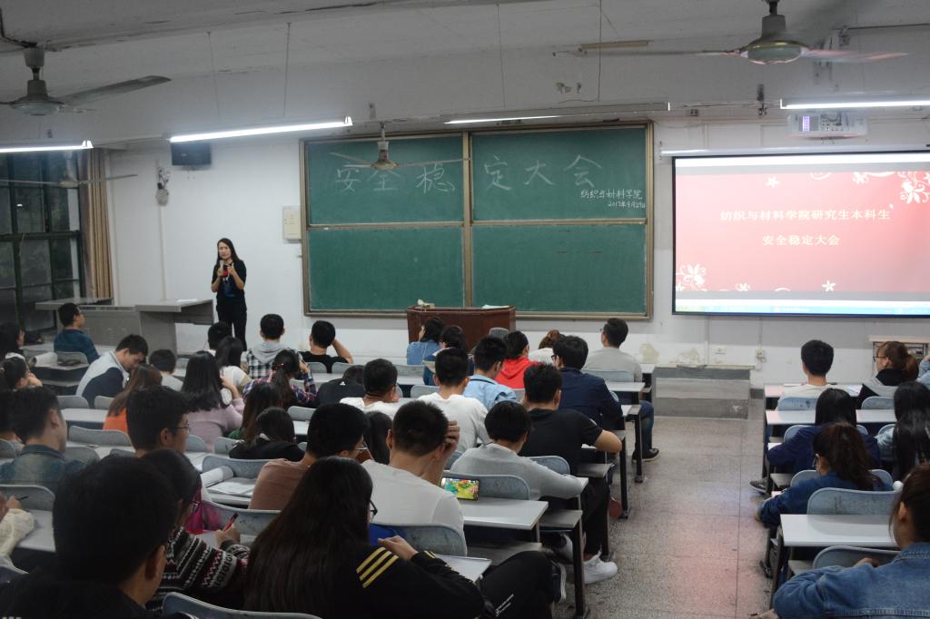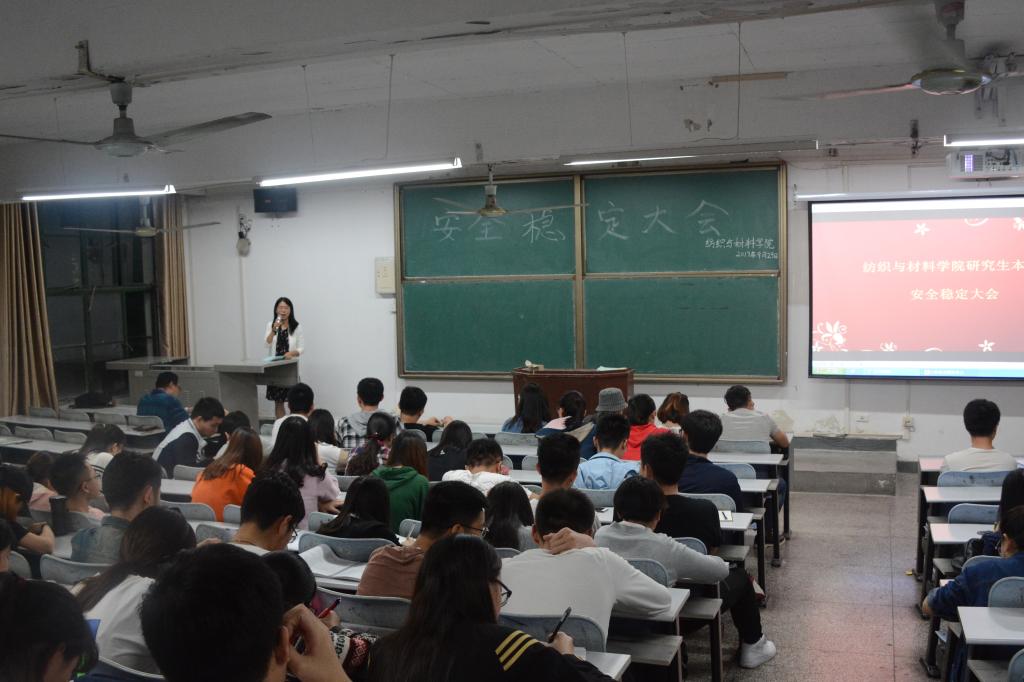 2017年9月29日18时,纺织与材料公司在金花校区1-226举办了研究生本科生安全稳定大会。纺织与材料公司党委书记阚佩、党委副书记郭西平、员工工作办公室主任赵勇进、团总支书记付成程以及研究生、本科生的全体员工干部参加了本次大会。本次大会由赵勇进主持。