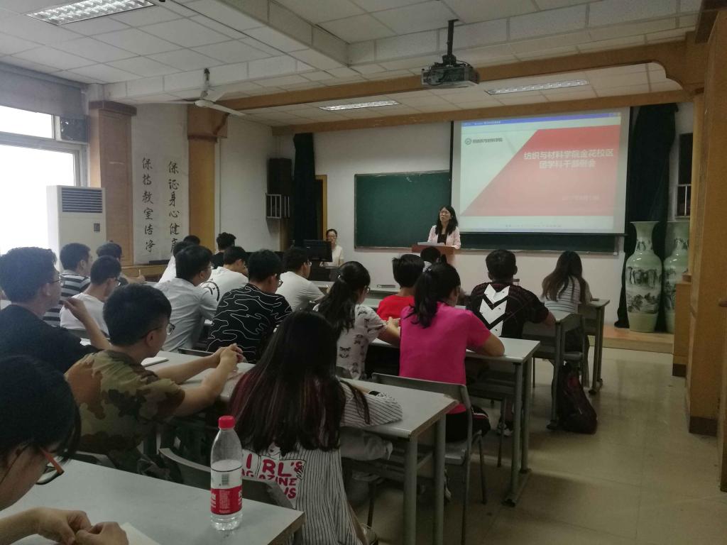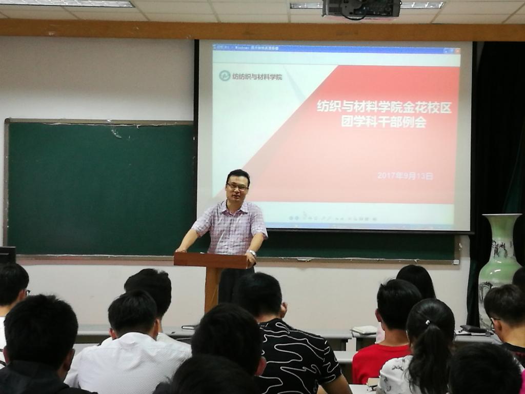 2017年9月13日5点,纺织与材料公司在金花校区纺织楼姚穆报告厅顺利召开团学科干部例会,公司员工工作办公室主任赵勇进、团总支书记付成程和金花校区团学科全体干部参加了此次例会。