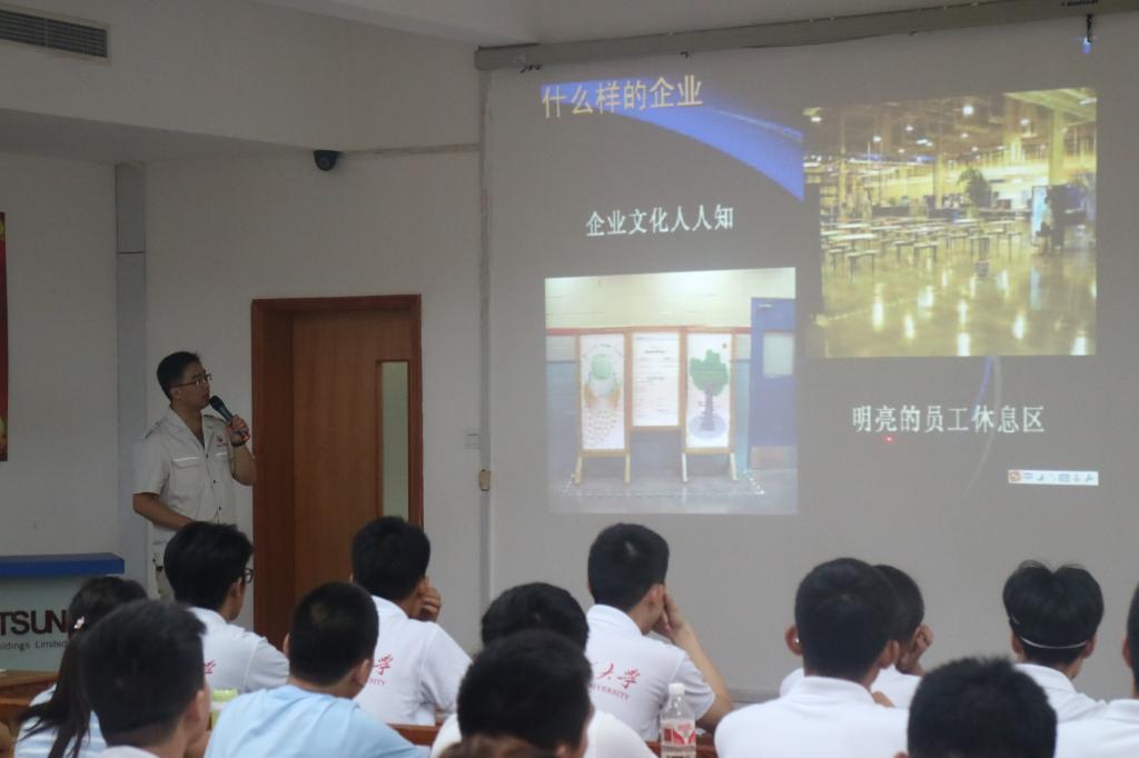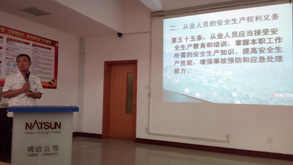 7月18日7点30分,山东实践队全体成员在南山纺织服饰有限公司精纺公司党员活动室进行实习培训。本次培训分为四部分。第一部分由人力资源部李岩主讲,她首先介绍企业文化,从集团简介、发展历程、产业发展、纺织服饰公司简介等8个方面让实践队成员对南山集团有了全新的认识,“厚德至善,峰聚成山”诠释了南山集团的精神。之后又详细介绍了南山集团规章制度和福利待遇。