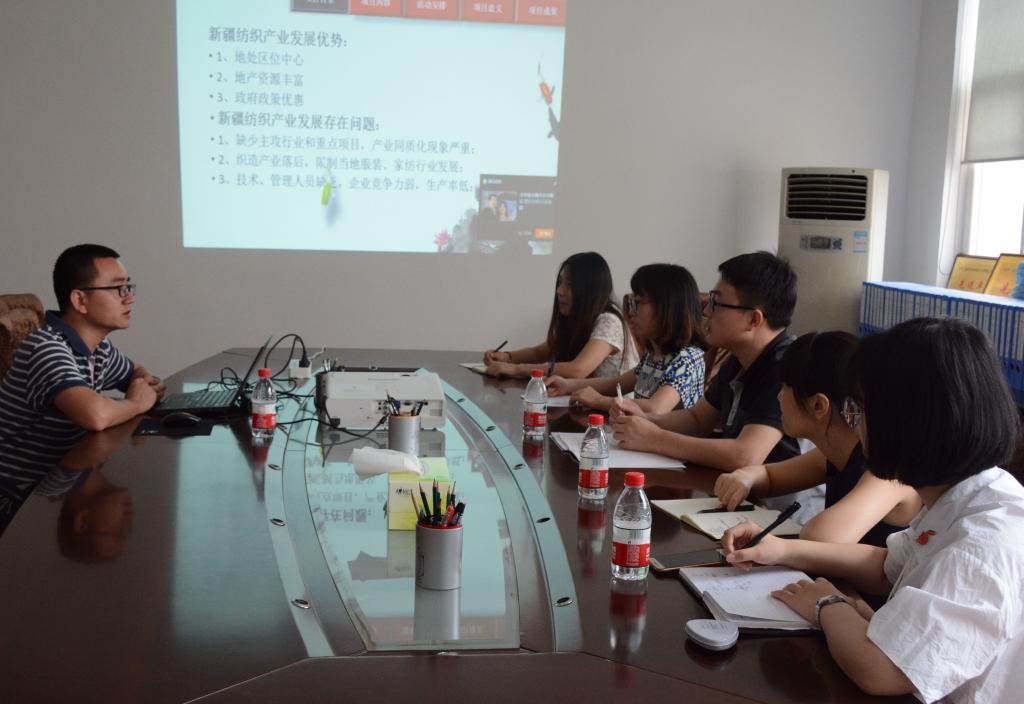 7月6日下午,援疆实践团召开了专题教育大会,会上带队教师师文钊对新疆纺织产业现状及存在的问题进行了简要介绍。会后,同学们也根据相关情况和每个队伍的任务,积极查询资料,为援实践做好知识准备。