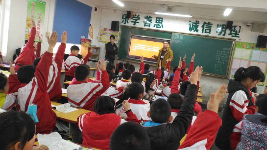 本次宣讲的主题为“生活中的科技”,课程共计一节,干事们同时对四年级1、2、3班进行授课,授课方式也分为两种,分别为课堂讲义和实物展示。首先,由实践部干事在播放PPT的同时,进行提问。整个流程有条不紊,图片的展示,有奖竞猜,快速抢答等环节都调动了每位员工的积极性,也教授了小员工们许多科技知识。临潼小学的同学们听得十分认真,每个人都参与了科学问题的答辩。接着,宣传部干事展示了利用废弃品制作的飞机、坦克,同学们都在认真观摩的同时,也增加了自己对科技的热情。