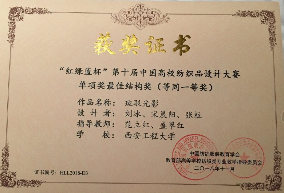 2018年11月10-11日,由中国纺织服装教育学会、教育部高等公司纺织类专业教学指导委员会联合主办的“红绿蓝杯”第十届中国高校纺织品设计大赛颁奖典礼暨纺织工业设计高层论坛在浙江绍兴举行。公司2015级纺织工程专业的宋晨阳、刘冰、张粒三名同学设计织造的作品《斑驳光影》作品获得“最佳结构奖”,指导教师范立红获“优秀指导教师”荣誉称号,范立红老师撰写的教改论文获“优秀论文奖”。