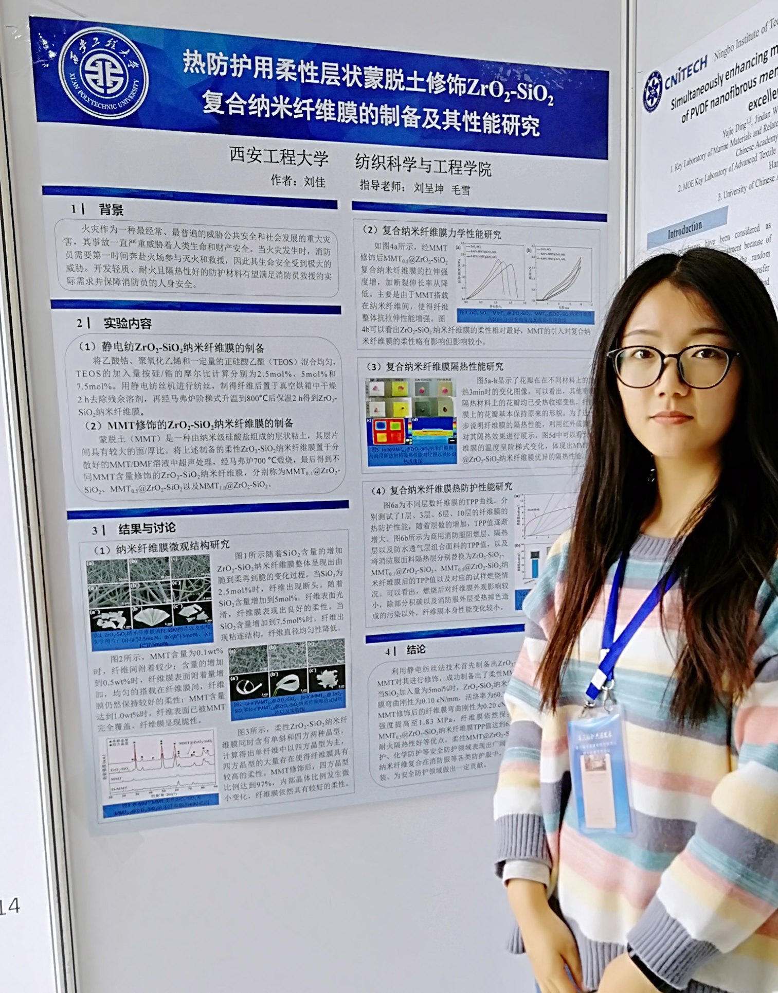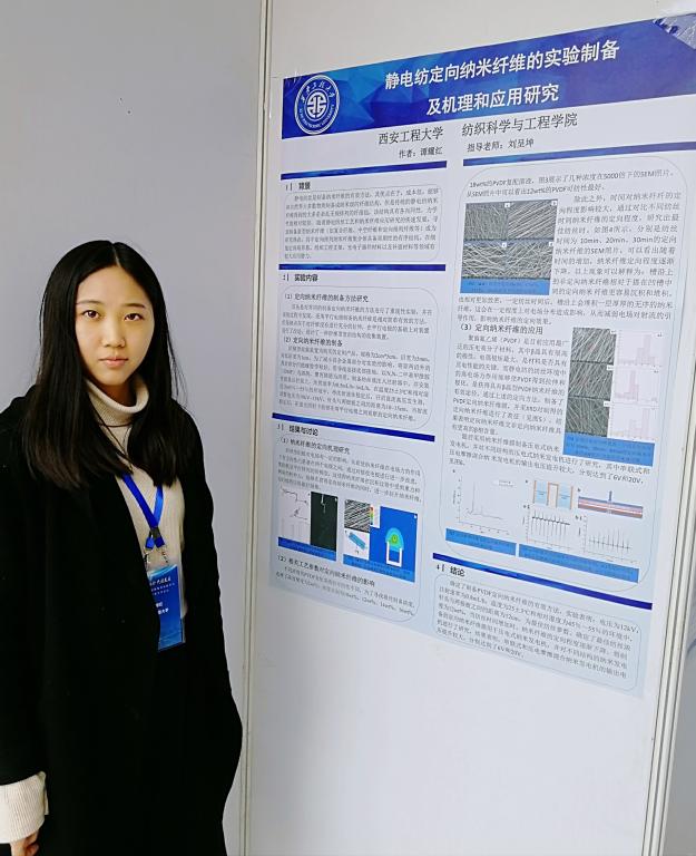 公司教师张晶博士代表团队做了专题报告。报告以微尺度药物缓释纤维的研究为切入点,通过药物缓释系统和抗癌pH敏感治疗的背景知识分析,深入的介绍了载药纳米纤维的制备流程及其性能表征,并介绍了团队在静电纺丝领域所取得的成果。并与现场师生进行了互动学术交流。公司16级硕士生谭耀红、刘佳分别以“静电纺定向纳米纤维的实验制备及机理和应用研究”、“热防护用柔性层状蒙脱土修饰ZrO2-SiO2复合纳米纤维膜的制备及其性能研究”为主题参与了墙报展,并向参观人员交流讲解课题成果。刘佳同学荣获大会“优秀墙报奖”。