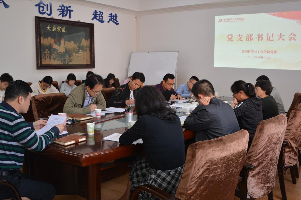 4月30日,纺织公司党委在金花校区纺织楼4楼会议室召开公司党支部书记大会,传达学习上级有关会议和文件精神,安排2019年公司党委重点工作,部署各党支部近期工作。公司党委书记胡小进、副书记郭西平、各党委委员和全体教工、员工党支部书记参加会议。会议由胡小进主持。