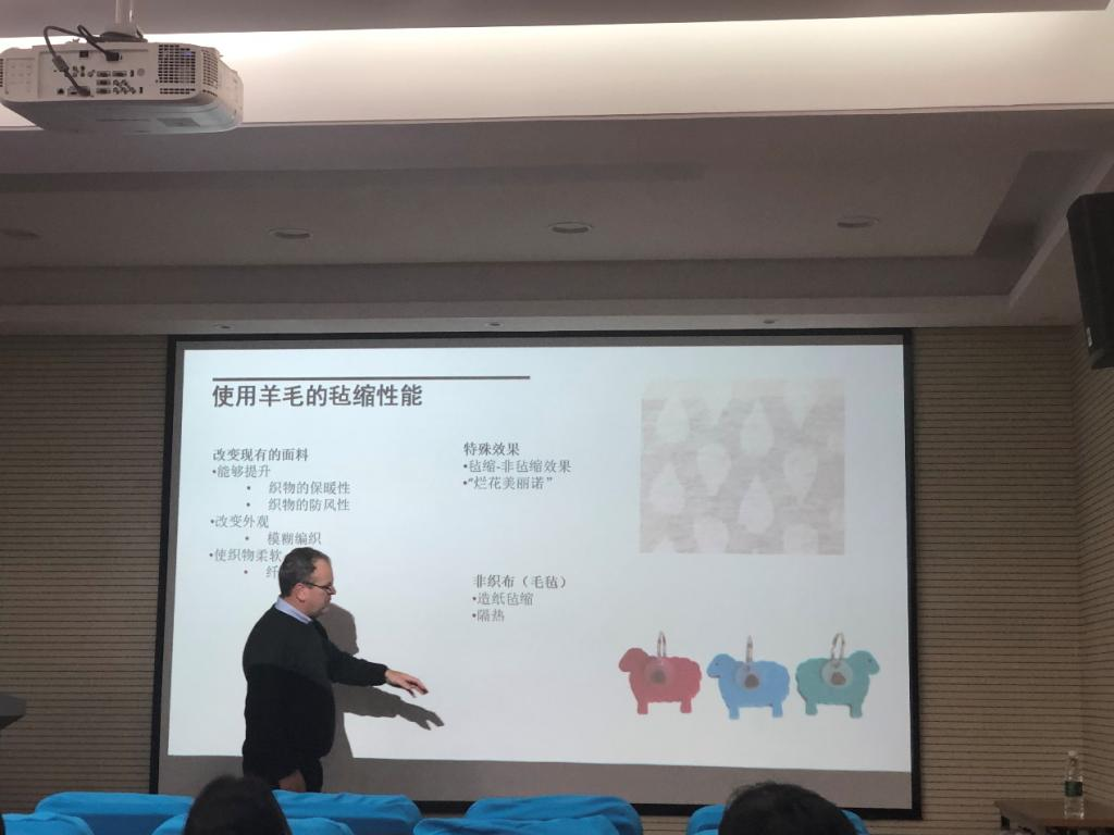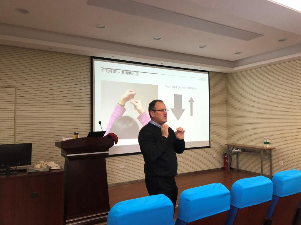 此次Chris Hurren主讲的《羊毛纤维科学与染色》专业课程,共计24学时,主要讲授澳大利亚羊毛纤维的结构、基本性能和羊毛染色等专业知识。授课采用全英文教学模式,教学严谨的Chris老师在一些难懂的专业名词上为员工进行了中英文对照注释,在同学们听不太懂的专业知识上用实物、视频、案例等进行说明,教学互动频繁,课堂气氛活跃,教学效果很好。