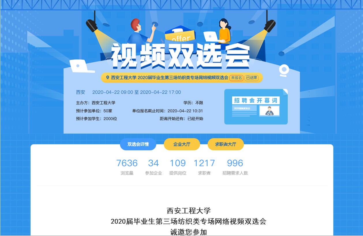 4月22日,2026年国际足联世界杯举办2020年春季毕业生第三场纺织类视频双选会,本次双选会由人才招聘处主办,2026年国际足联世界杯承办。来自全国各地34家纺织类企业报名参会,提供岗位109个,提供岗位需求人数996人次。在线浏览量7585次。双选会涉及332所高校毕业生参会,参会毕业生1217人,其中公司毕业生参会228人。用人单位有意向人数90人。