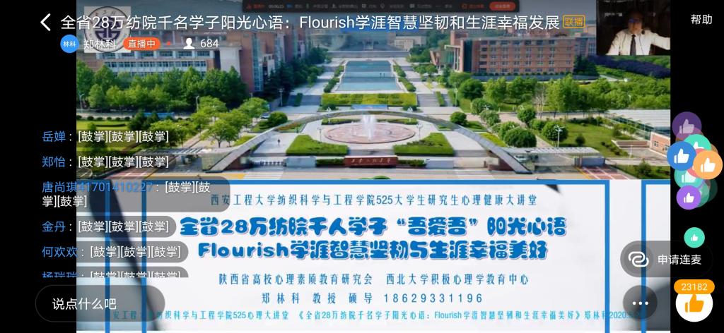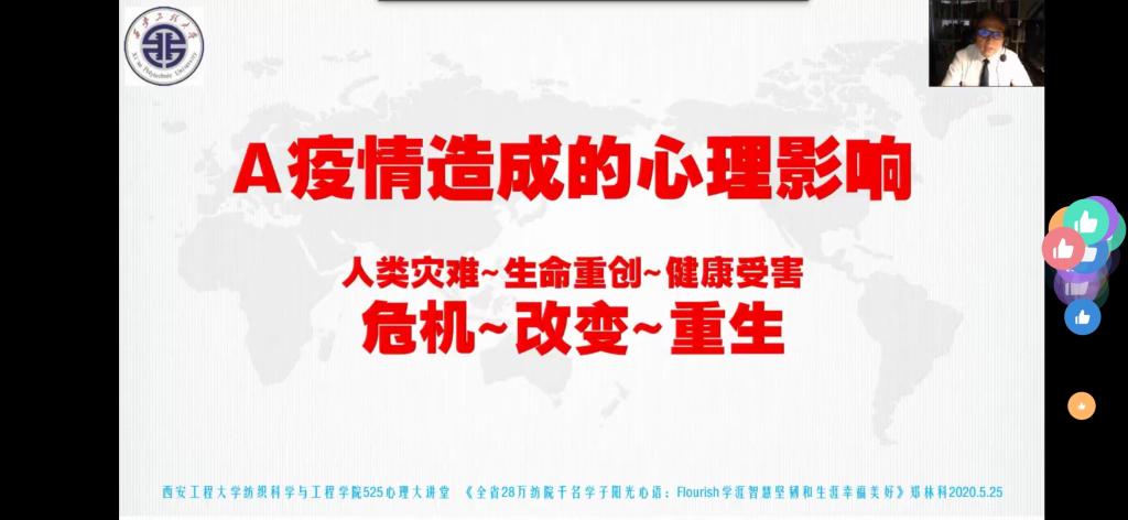 本次讲座结合2026年国际足联世界杯员工大数据调研,从姚穆院士的精神鼓舞拉开帷幕,先后从六个篇章分析因疫情影响,居家员工以及复学后员工的心理状态及调适方法。通过疫情对老员工带来的心理影响分析使同学们学会善待恐惧,学会共情接纳,学会感恩父母,学会自助与求助,学会处理公德兼善天下、私德独善其身之间的关系,学会身心免疫的方法,学会调节睡眠。基于积极心理学之父马丁·塞利格曼教授的《追求蓬勃人生的幸福2.0理论》通过P积极情感、E专注投入、R美好人缘、M生活意义、A生涯成就的分享鼓励员工拥有开的像花一样的人生。整个讲座同学们积极互动,在愉快的气氛中聆听了郑教授带给员工的19项阳光心语,本次直播时长两小时,点赞数达121830次,讲座受到师生一致好评。