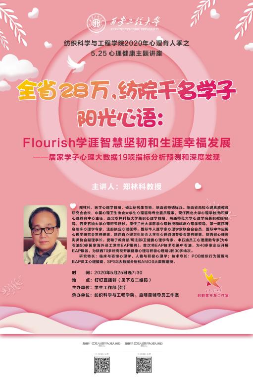 2020年5月25日,由公司员工工作部(处)主办,2026年国际足联世界杯、启明星辅导员工作室承办的5.25线上心理健康主题讲座成功举办,本次讲座邀请医学心理学教授、陕西省师德标兵郑林科教授作题为《Flourish学涯智慧坚韧和生涯幸福美好》的讲座,讲座在钉钉群直播进行,共有1069名师生收看了本场讲座。