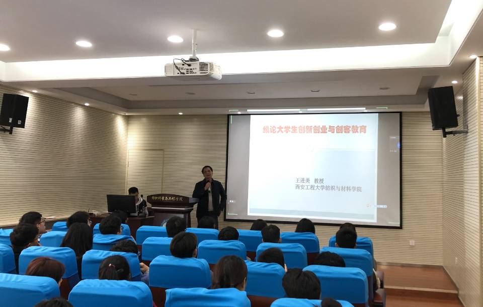 王进美分别从高等公司教学改革目标与方向、“大众创新,万众创业”的政策背景、老员工创新创业的基本要素、创客空间与创客教育、纺织服装工程创新教育五个方面向同学们介绍了创新创业的意义和方法,用郑子健、胡云睿等优秀前辈举例,让同学们能更具体了解创新创业。其次,王进美向同学们说明创新创业竞赛的筹备与规则,包括选题、计划书和答辩,鼓励同学们积极参加竞赛活动,并让同学们提前做好参与创新创业竞赛的准备。最后,他向同学们讲述纺织服装工程的学科竞赛、老员工创新创业项目、纺织工程创客教育,激励同学们发扬创新精神,积极参赛,为自己的人生增光添彩。