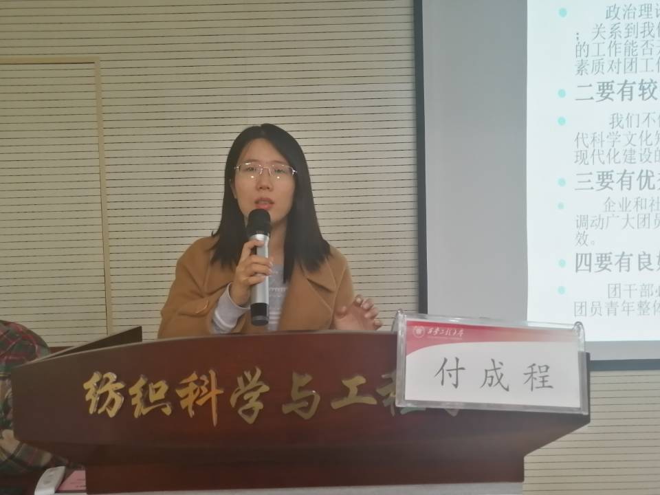 接着,孟雪从自己本科到研究生期间的思想、学习、生活和工作各方面和大家做了分享。她分享了自己做团员干部的经历收获和如何处理好学习和工作的关系。付成程希望全体团员干部向孟雪同学学习,不断提升自己,成为一名优秀的团员干部。