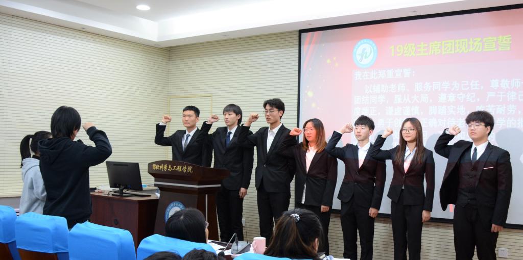 票数统计结束后,苏娜宣读竞选成功人员名单为曾强、张婉婷、蒋天昕、王俊翔、狄少波、宋鹏程、周子淇,作为新一届团学科主席团成员。最后,2018级员工会主席熊亚睿带领新一届主席团宣誓并进行院旗交接仪式。