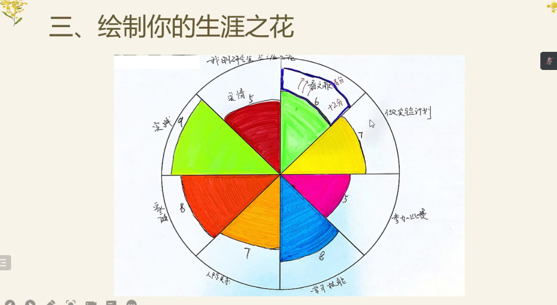 最后,高老师带领大家绘制生涯之花。高黎老师让大家拿出了一张白纸,将一个圆分为八个部分,让同学们分别在这八个部分写出自己在研究生生涯中重要的八件事,并进行计分。之后又由成功的逆过程让大家进行研究生涯规划。从“我要什么”到“怎样得到”“我现在所做的是否有利于得到我想要的”“我愿意为之付出什么样的代价”到“如何持之以恒”并给出相关建议,引导研究生们实现自己的价值。讲座最后,进行互动环节,同学提出自己的问题,老师进行解答,高黎老师提出,要树立三个意识,职业生涯规划的意识、积极行动的意识、终身学习的意识。在研究生期间遇到问题时,积极求助,尝试新的生活和思维方式,或者多阅读。