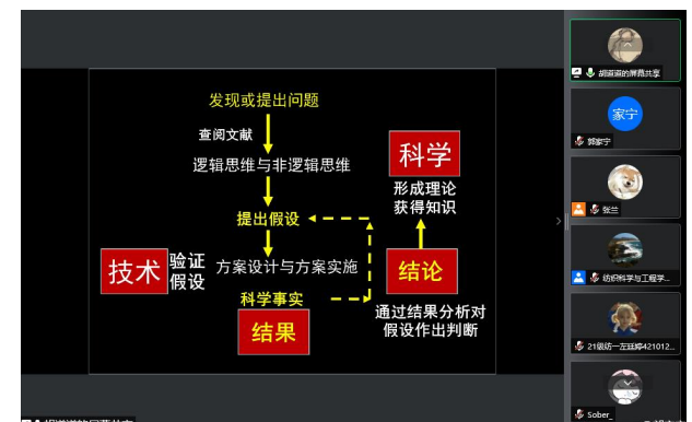 本次讲座分为两大部分:第一部分为科学研究简介和学术论文写作。首先,胡道道教授从近代科学研究的起源开始向我们简介什么是科学研究,并且提出问题“为什么科学和工业革命没有在近代的中国发生”,最后,胡教授向同学们介绍了科学研究的主要步骤:提出问题,猜想与假设,制定计划与设计实验,进行实验与收集证据,分析与论证、评估,交流与合作。第二部分,胡道道教授主要讲述了学术论文、科技论文论文、科技论文的书写方法。他从论文的拟题方法、摘要、引言、结果与讨论等方面一一讲解,向同学们展示了论文的主体结构和主要要素,用流程图向大家介绍了论文写作的整个过程。胡道道教授希望同学们养成勤于思考的习惯,以理论为功底,多读多练。