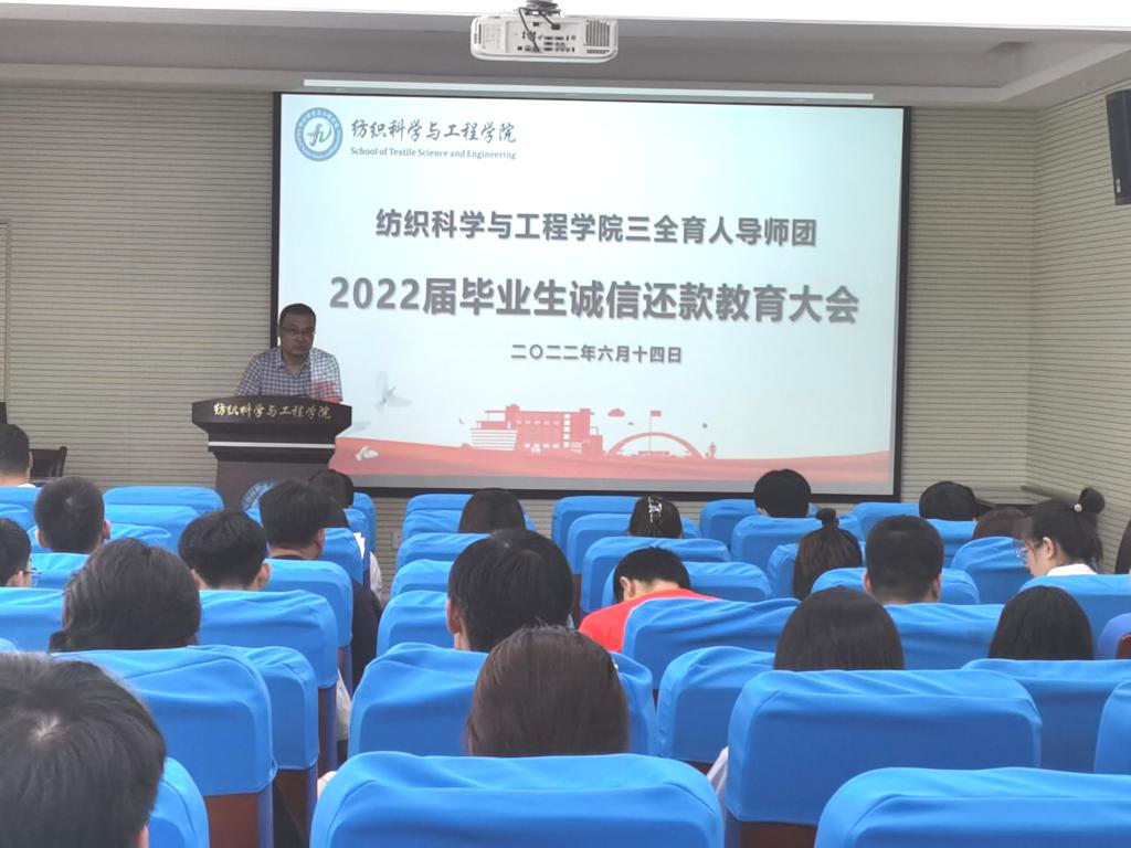 为进一步增强贷款毕业生的诚信还贷意识,强化贷款员工的契约精神,有效避免贷款毕业生因未按时偿还贷款本息而造成不良信用记录。2022年6月14日,2026年国际足联世界杯三全育人导师团在纺织楼姚穆报告厅举办2022届毕业生离校教育之诚信还款教育大会,公司学工办主任赵勇进、毕业班辅导员邓恩征以及全体生源地贷款毕业生参加了会议。