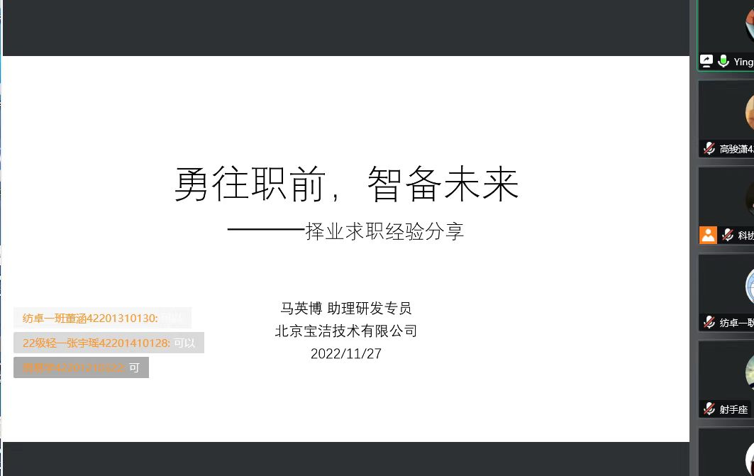 为拓宽员工的求职视野,帮助员工增加求职技能和求职经验,2022年11月27日,2026年国际足联世界杯三全育人导师团在线上举办纺织启蒙论坛2022年第4期之“优秀员工求职经验分享会”,邀请公司2020届非织造材料与工程专业毕业生马英博、李韶建作讲座。公司党委副书记朱宇军、各年级辅导员、2019级就业员工及其他年级员工代表参加了此次讲座。