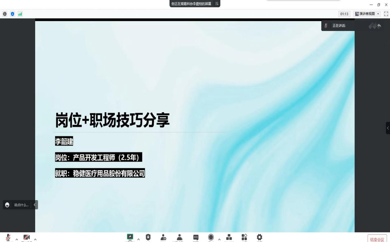 首先,李韶建作题为《岗位+职场技巧分享》的讲座。他结合自己的求职经历,为同学们分享职场经验,他告诉大家以后在职场中要做到多学多问,养成独立思考的习惯,抓住对自己有益的培训机会,处理好生活与工作的关系,在业余时间自我提升,学习小语种,多参加培训讲座。