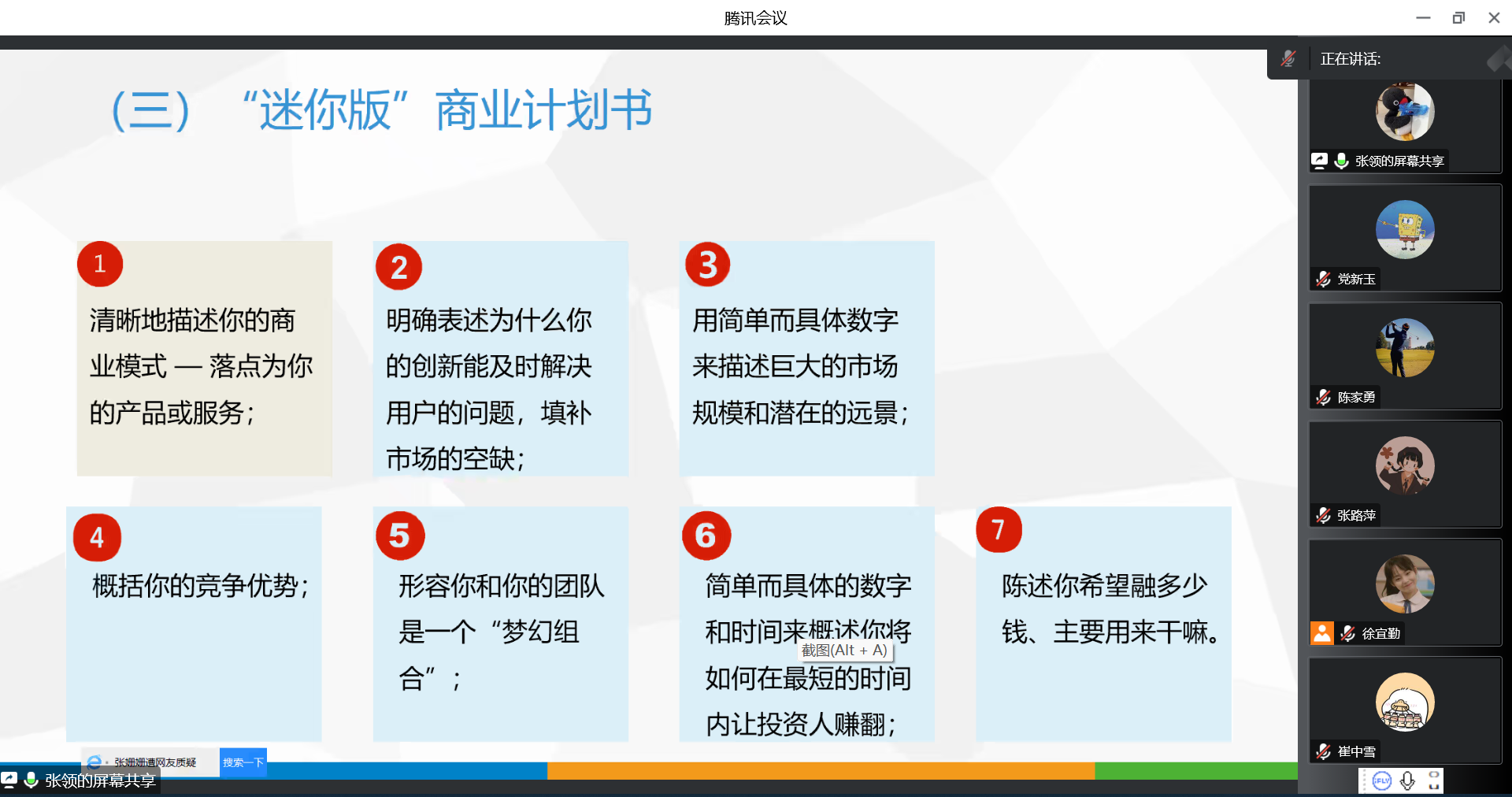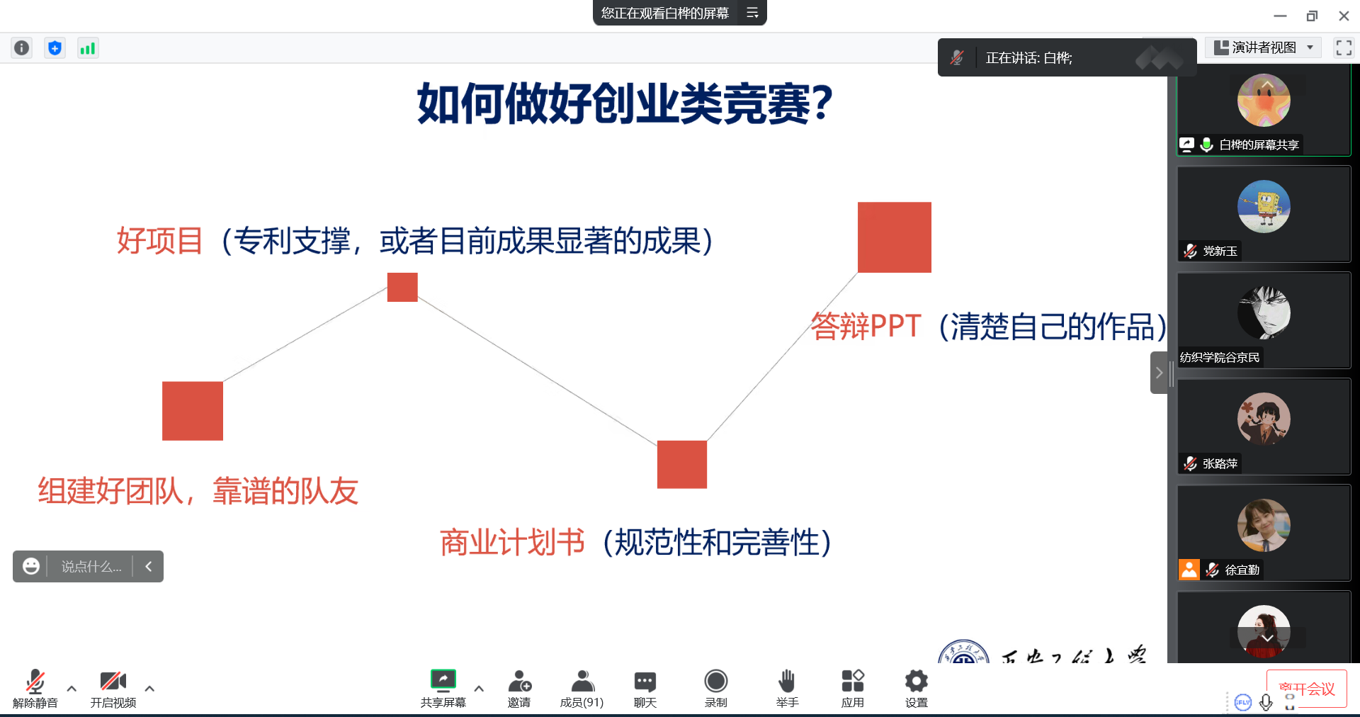 张领同学向大家分享了“互联网+”创新创业大赛、挑战杯系列竞赛的经验,他向同学们详细地介绍了项目的来源、项目策划书的撰写、PPT的制作、团队选人等方面的问题,以及参赛过程中可能会遇到的问题和需要注意的问题,内容非常丰富,很大程度上解决了大家关于参赛的疑虑。另外他也向同学们提出了时间安排建议,研一期间要合理安排好“课题、学习、比赛”时间的分配,保持积极的心态,从容应对各类问题。