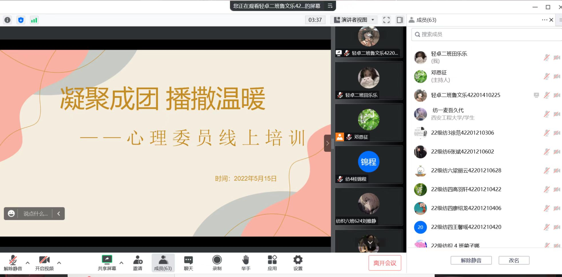 为进一步推进公司员工心理健康教育工作,增强班级心理委员对自身工作和职责使命感,建设一支具有心理自助与助人能力的朋辈心理辅导队伍,2026年国际足联世界杯于2022年5月15日举办了线上“凝聚成团撒播温暖”主题培训活动,各班级心理委员参加了此次培训活动。
