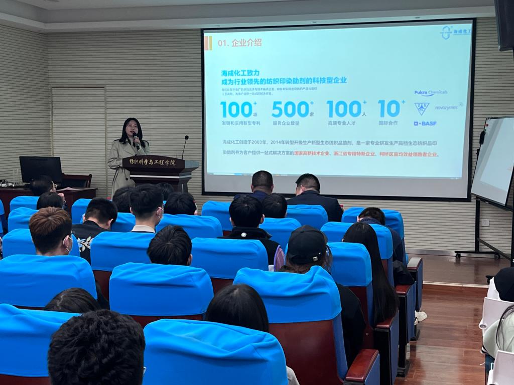 15日晚上,三家纺织企业在金花校区姚穆报告厅联合开展招聘宣讲会。2023届部分本科毕业生、研究生毕业生、2020级本科生代表参加了此次讲座。会上,三家企业负责人分别从企业概况、岗位需求、福利待遇等方面详细介绍了公司的各项政策。绍兴海成化工有限公司是一家专业研发生产高档生态纺织品印染助剂并为客户提供一站式解决方案的国家高新技术企业、浙江省专精特新企业、柯桥区亩均效益领跑者企业。公司招聘岗位主要为应用研究工程师、应用研究工程师、外贸专员等。浙江智兴集团有限公司是一家集印染、热电、房产、外贸、实体投资于一体的多元化民营企业,主要招聘ERP智能管理,技术研发员,储备干部等岗位的人才。杭州航民美时达印染有限公司是中国印染业十强浙江航民集团旗下专业染色印花各类棉、麻、天丝、涤棉、人棉,腈纶棉、芳纶粘胶等产品的国家级高新企业,主要有应用研究工程师、生产储备干部、外贸专员等岗位需求。