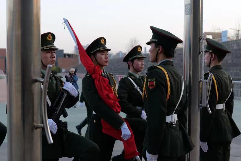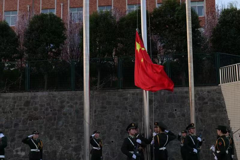 清晨6时50分,校国旗护卫队队员迈着雄健的步伐,护卫着五星红旗从东环操场北部走来。7时整,伴随着雄壮的《义勇军进行曲》,五星红旗在晨光中冉冉升起,在场的每一个人向国旗行注目礼,身怀对祖国的无限热爱和崇高的敬意,仪式庄严肃穆。