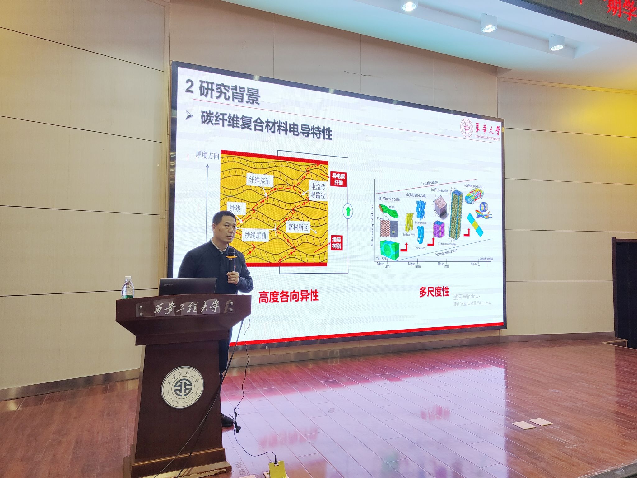 报告会上,顾伯洪教授从上海市现代纺织前沿科学研究基地建设目标任务、前沿科学问题、研究思路、技术路线等方面系统介绍了碳纤维纺织复合材料力电耦合行为、未来的导电结构和电力工程应用。接着介绍了上海市现代纺织前沿科学研究基地在纺织加工理论与技术、纺织化学与生态染整、纺织装备与智能制造方向的研究任务,然后从碳纤维纺织复合材料的服役环境与结构特征等方面系统介绍了研究背景与意义,展示了研究团队在纺织结构碳纤维复合材料冲击动力学、电热效应、力电耦合行为的最新进展,分享了研究团队在三维纺织复合材料冲击动力学与热电耦合效应、纺织复合材料热氧老化与强度降解、形状记忆复合材料多场耦合形变三个方向上的研究成果。