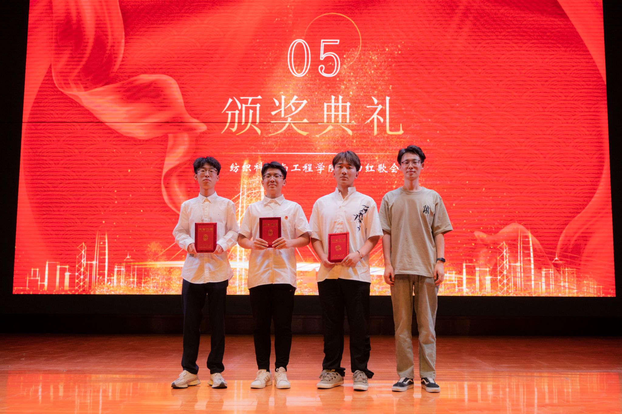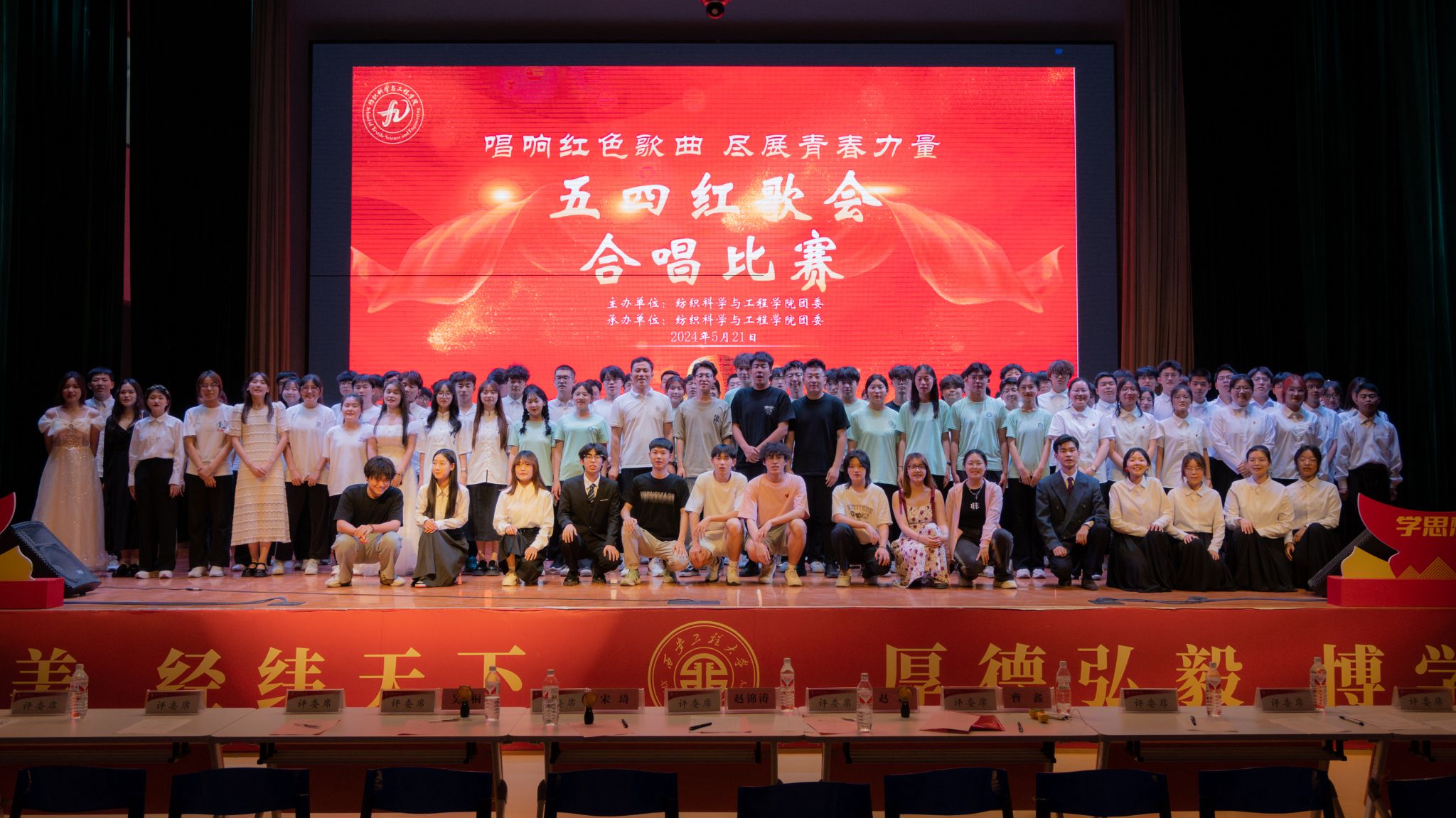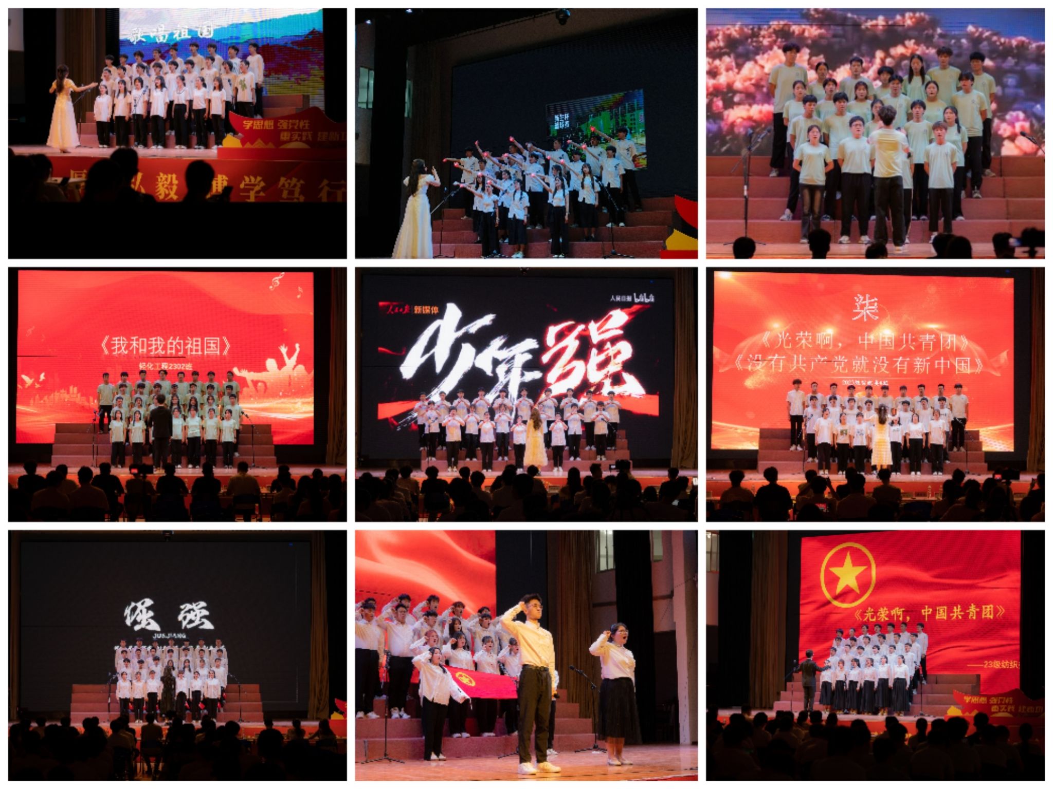 展演活动中,各参赛班级分别歌唱了固定曲目《光荣啊,中国共青团》和《我爱你中国》《少年中国说》《强军战歌》、《歌唱祖国》《社会主义好》等自选曲目,这些脍炙人口的红歌,将比赛推向了一个又一个高潮。尤其是纺织类2304班的一首《没有共产党就没有新中国》引发了全场观众的共鸣。这首歌以其激昂的旋律和动人的歌词,展现了中华民族不屈不挠的奋斗精神。参赛选手们用激情昂扬的嗓音,将这首歌曲演绎得淋漓尽致,赢得了现场观众的阵阵掌声。