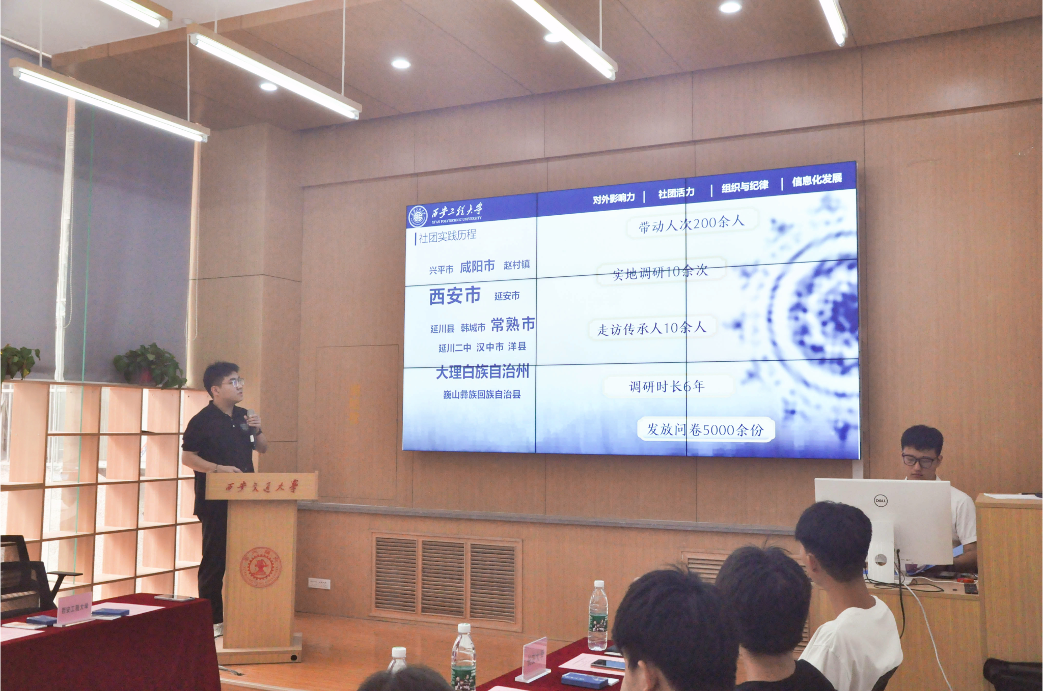 魏冉阳同学代表手工印染社在论坛上进行了发言。他就如何加强社团的对外影响力、激发社团活力、提升社团的组织性和纪律性,以及如何利用网络平台提升社团的信息化建设水平等主题,与来自陕西省内各高校的社团代表进行了深入的交流和分享。在分享中,他详细介绍了手工印染社自成立以来在非遗传承方面所做的努力和取得的成就,强调了社团在文化传承、社会服务、教育实践等方面的积极作用,并分享了社团如何通过创新活动和有效管理提升自身的社会影响力和组织效能。