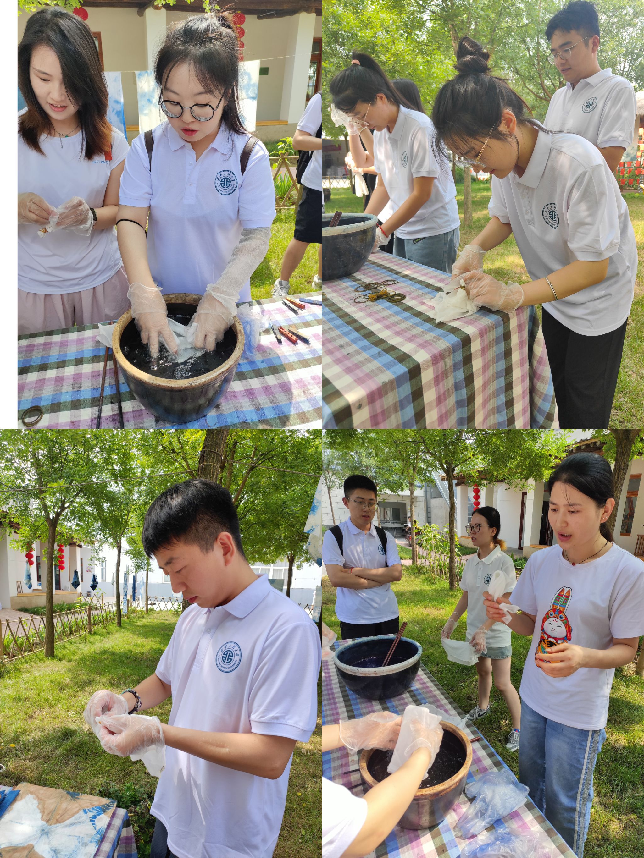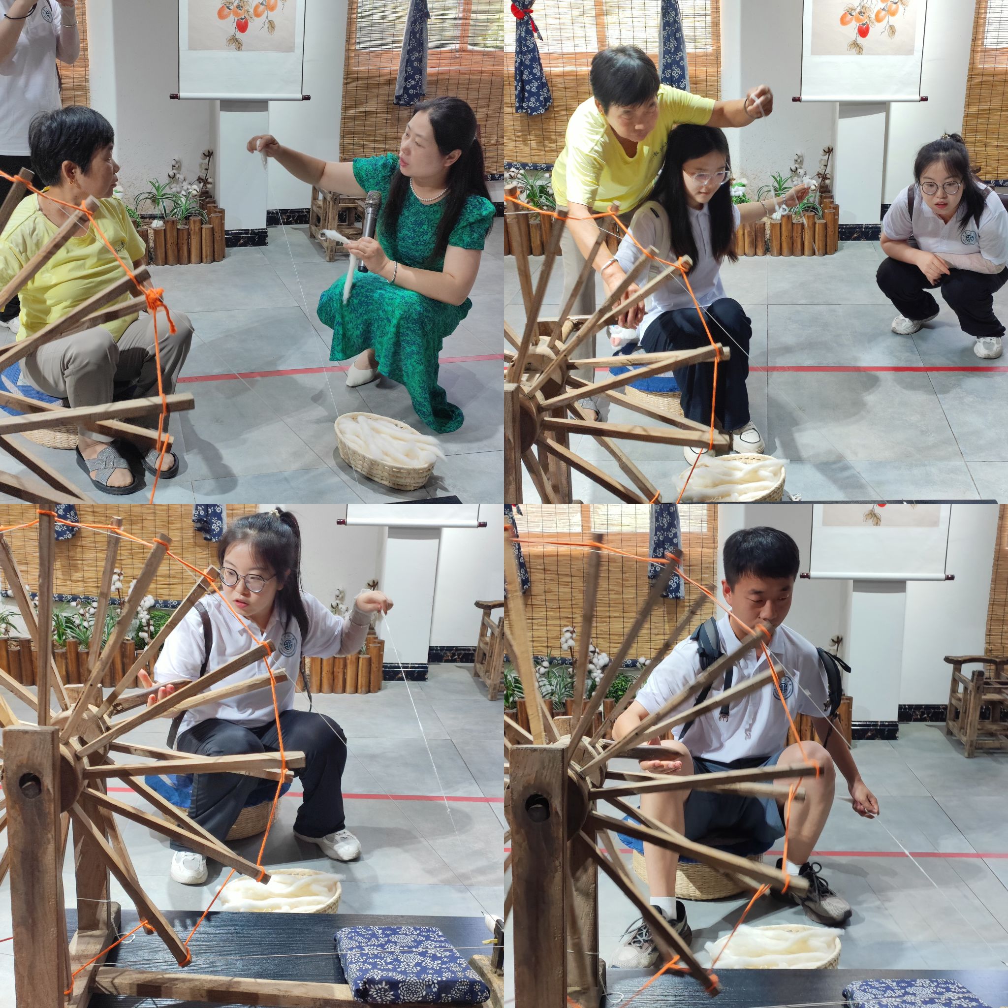 本次培训活动特别设置了动手实践环节,并由张董事长和技艺娴熟的工人亲手教授员工棉花纺线、织布、扎染等技艺。学习纺线时,员工们按照演示示范一手持棉条子送入纺纱机,一手摇动纺纱机,将棉花纤维加工成连续、均匀且具有一定强度的棉线;在织布车间,他们学习了横纬竖经的奥秘,亲手操作织布机,感受着纱线交织成布的奇妙过程;而在扎染环节,同学们更是发挥无限创意,将一块块布料折叠、捆扎,再浸入染料中,创造出独一无二的艺术品。整个过程中,张董事长和工人耐心指导,指出操作过程中出现的问题并一一指导改正,确保每位同学都能真正掌握这些传统技艺的精髓。