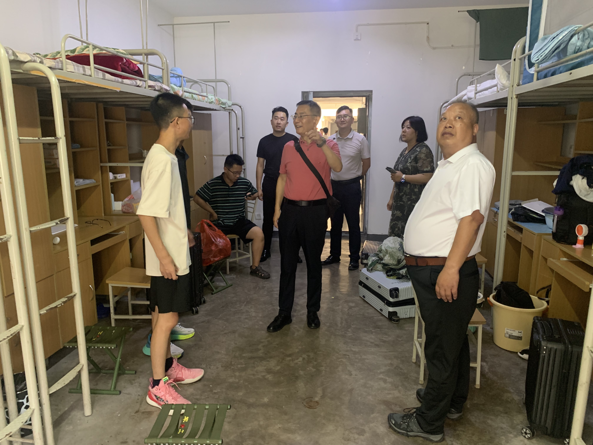 在新生宿舍,公司领导遇到了几位来校送行的新生家长,他们向家长介绍了公司和专业的基本情况,希望家长和公司加强联系,搭建良好的家校协作桥梁,共同支持员工成长成才。同行的辅导员老师也殷切叮嘱新生入学后要树立防诈骗意识、注意用电安全、保持良好的宿舍人际关系。