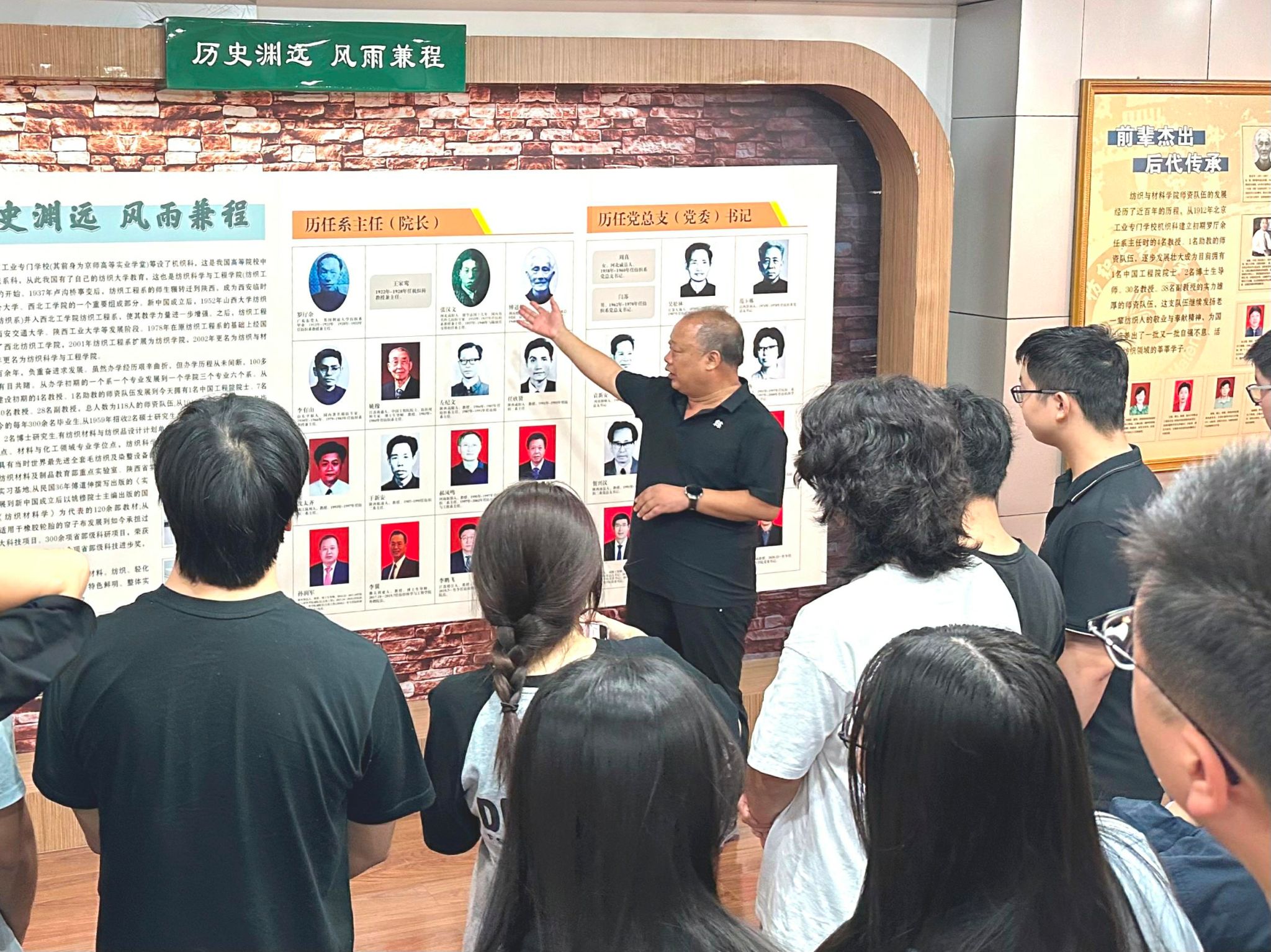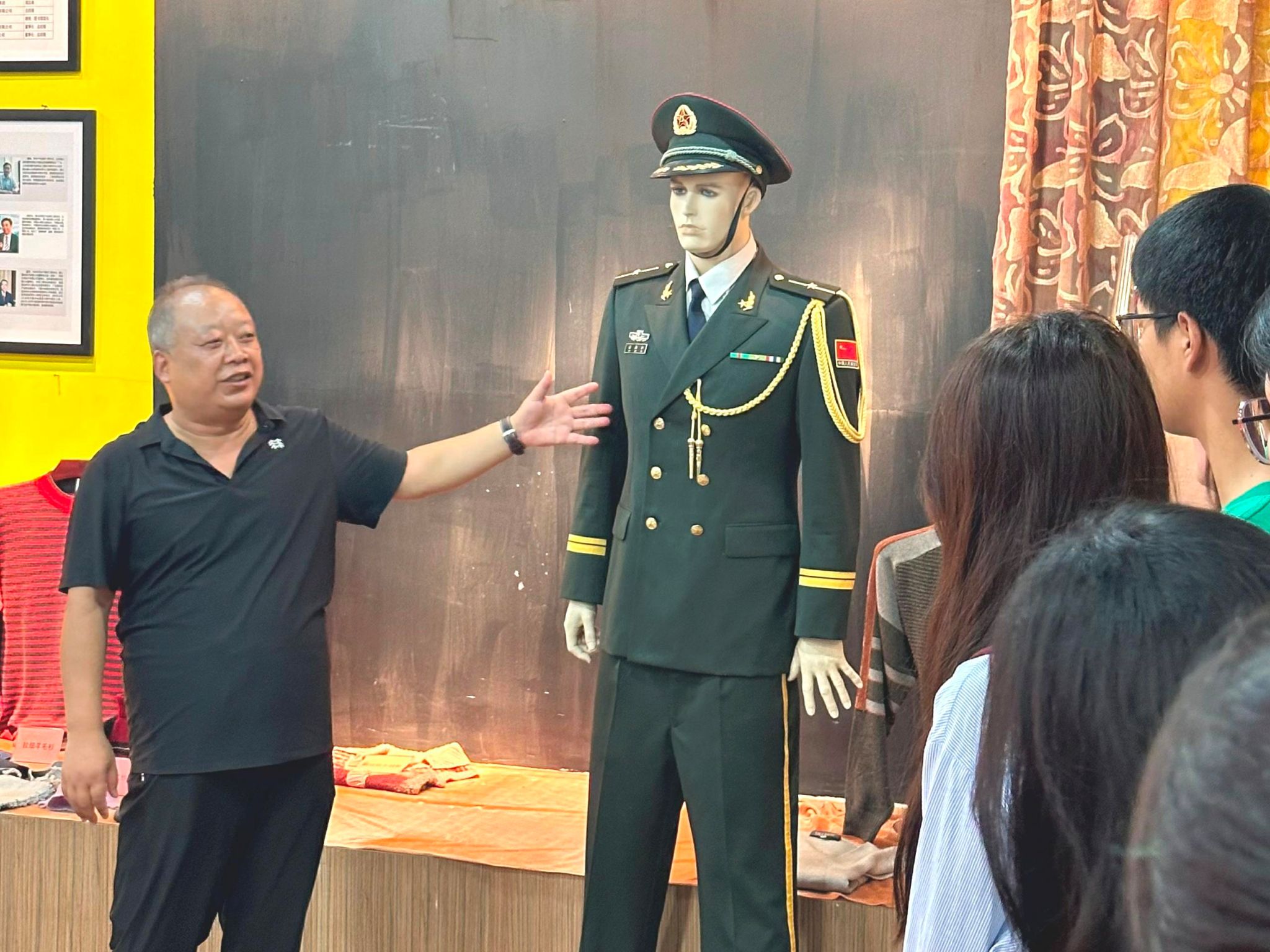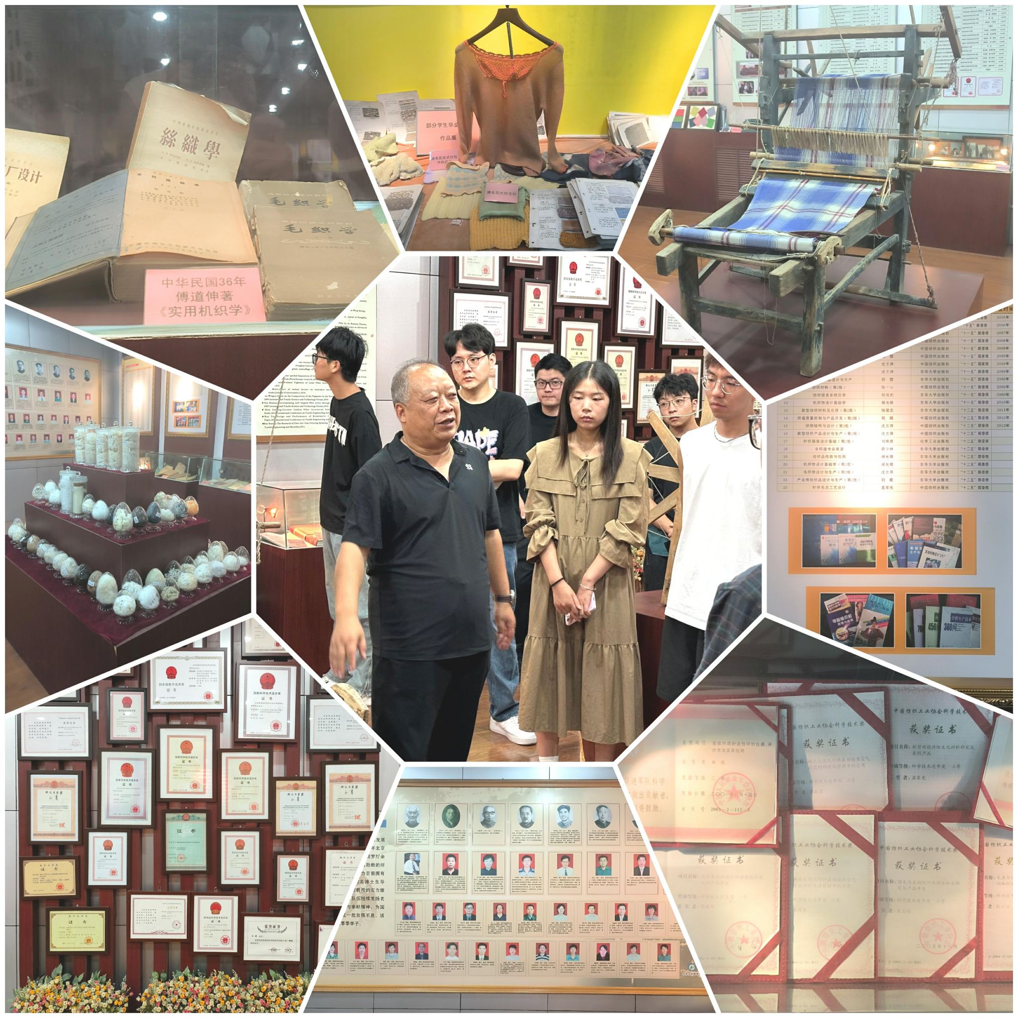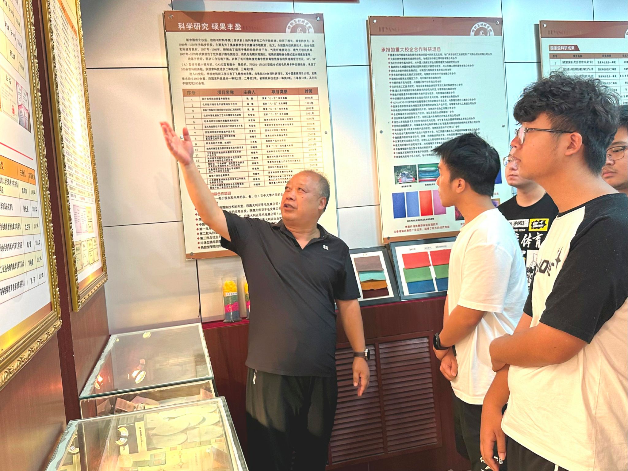 院史馆内,一件件珍贵的展品、一幅幅生动的图片,无不诉说着公司百年的辉煌历程。孙经理以深入浅出的方式首先为新生们勾勒出了公司从创立至今的壮阔发展历程。来到书籍展区,这里不仅展示了公司1959年招收的第一届研究生的毕业论文等珍贵历史资料。此外还有员工的实习日记、公司自编的多部教材等。紧接着,孙经理引领大家来到荣誉墙前。墙上挂满了公司师生荣获的各类奖项,包括国家科学技术进步奖、国家教学成果奖等,每一项荣誉都凝聚着纺织人的智慧与汗水,彰显着公司在科研与教学领域的卓越成就。最后是服装展区,两个身着军服的假人模特尤为引人注目。孙经理介绍这是公司姚穆院士专为驻港部队设计开发的“军港纶”面料制成的军服。该面料以其挺括透气、易洗快干、不易褪色等特性,赢得了广泛赞誉,成为公司科研成果转化为实际应用的典范。