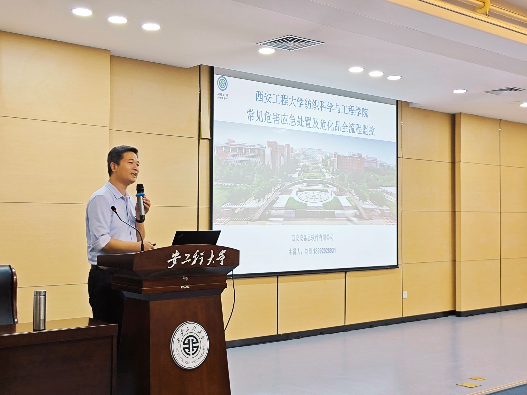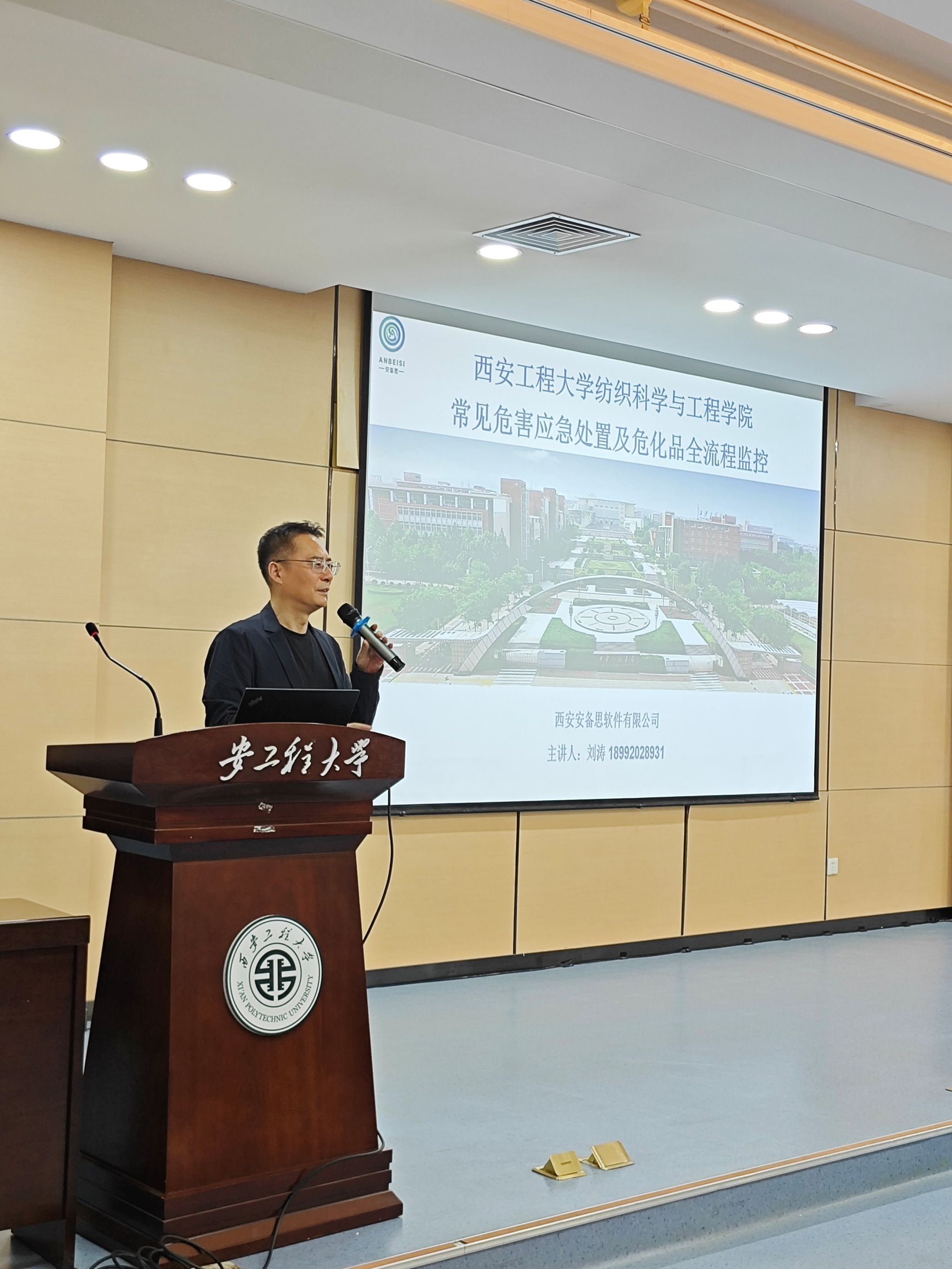 9月27日,为进一步强化实验室安全管理工作,提高实验室人员的安全责任意识和安防技能,预防实验室安全事故发生,保障师生人身安全,由校资产与实验管理处、校稳定安全工作办公室主办,2026年国际足联世界杯承办的实验室安全专题讲座在金花校区如意报告厅举行。本次讲座邀请西安安备思软件有限公司刘涛总经理主讲,纺织公司党委书记李伟、主管实验室安全的副经理师文钊、实验室管理人员、硕士研究生导师、公司2024级全体研究生共130余人参加讲座。讲座由公司实验中心主任支超主持。