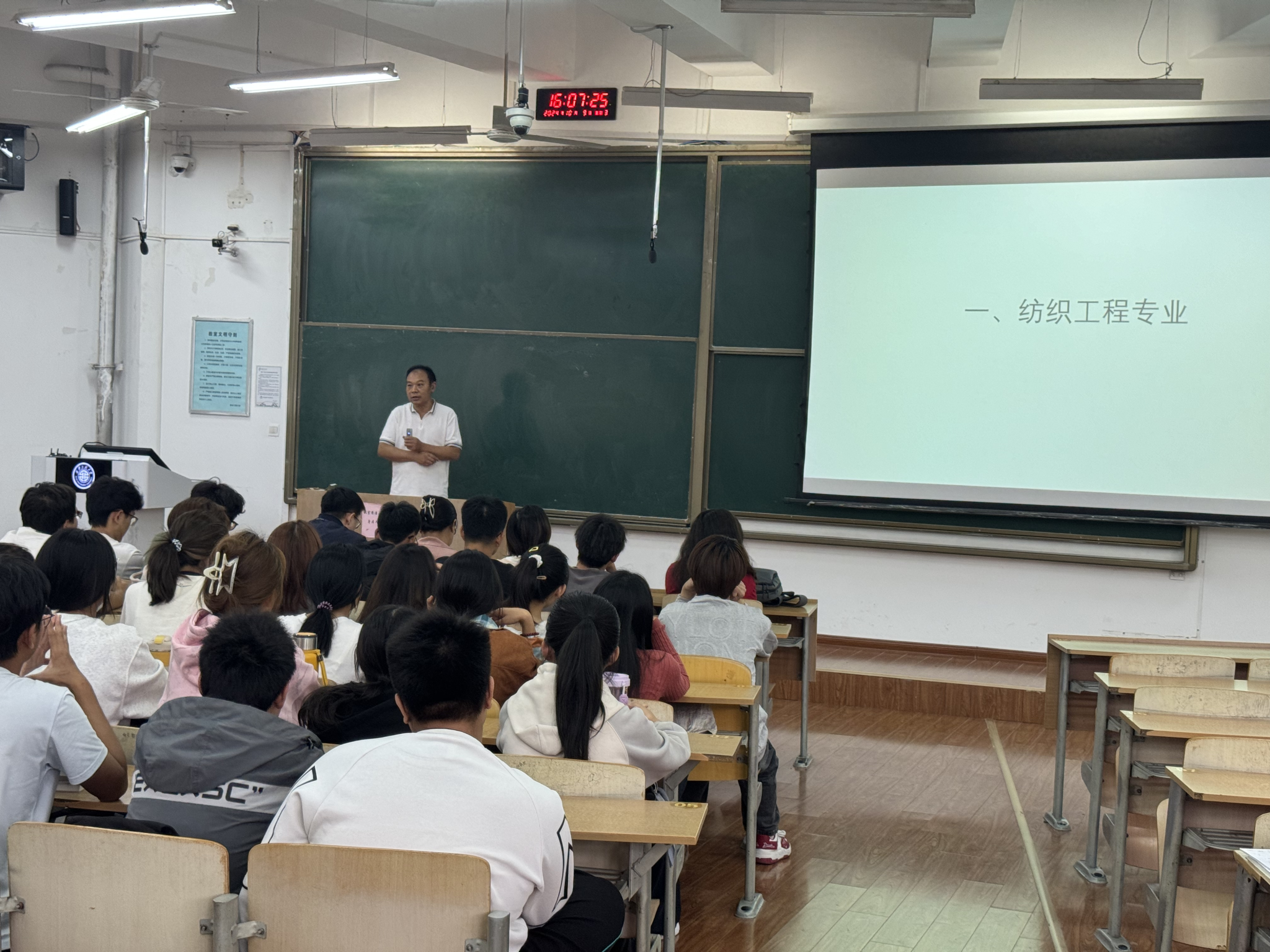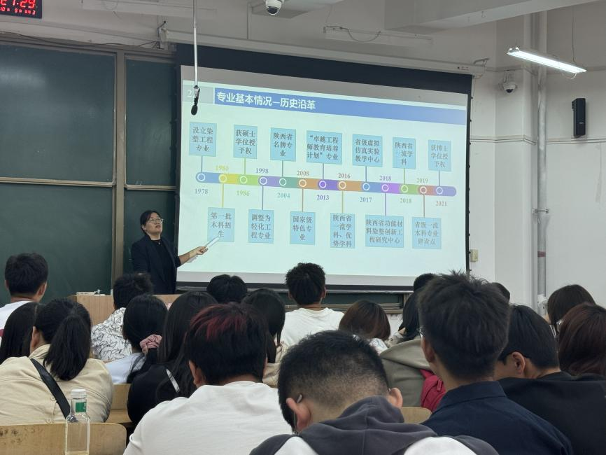 参加专业介绍的老师有:纺织工程专业谢光银教授、现代纺织技术与贸易系副主任申国栋、纺织材料与现代检测技术系副主任范星宇、纺织品功能与时尚设计系副主任董子靖、智能针织与生态服装系教师王永臻、非织造材料与工程专业系主任韩玲、轻化工程系副主任张帆。各位老师主要从专业发展、课程设置、学习内容、就业去向进行介绍,引导新生思考如何将专业知识与教育研究相结合、将个人发展与国家建设相结合。员工收获满满,现场反应热烈。