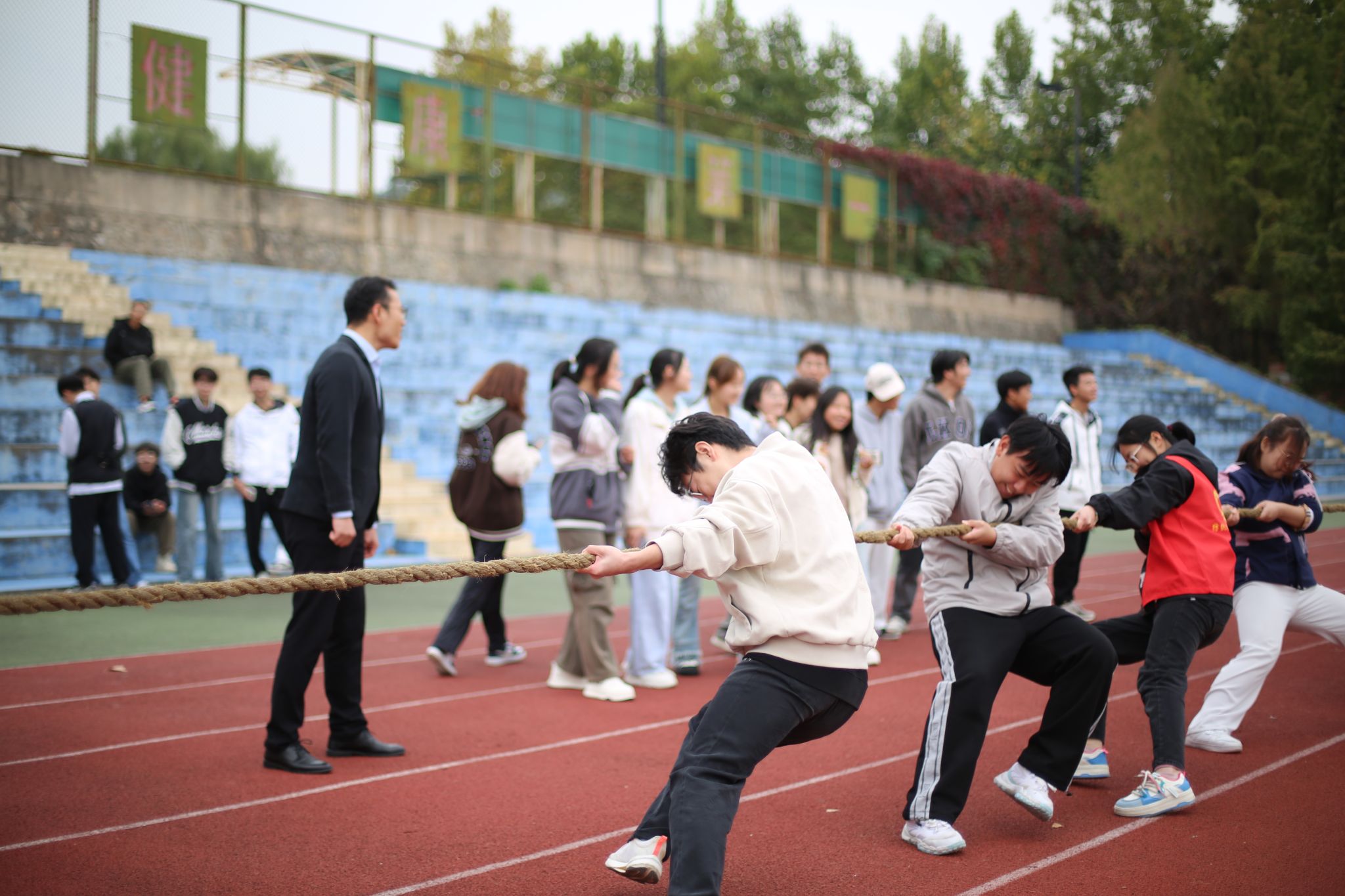 随着所有同学有序入场,本次活动也拉开序幕。首先,文艺部的同学为大家献上了精彩的演唱,调动了现场的氛围。紧接着,我们开始了本次活动的第一个项目——拔河,以每班五男五女的配置进行比赛。