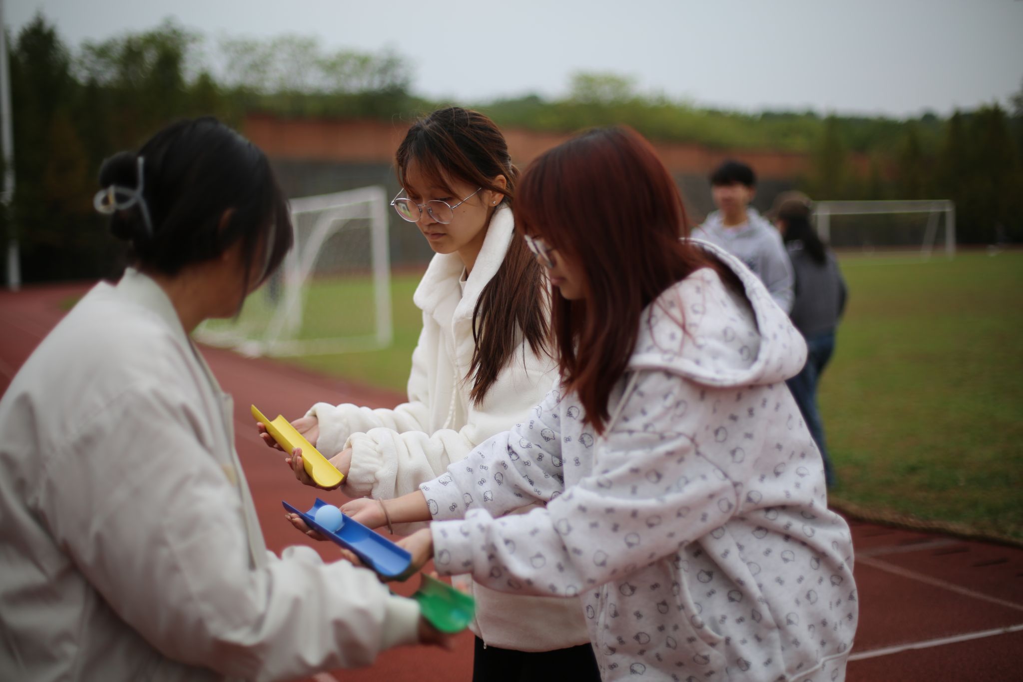 在这之后,又陆续进行了背靠背夹气球(每班三人)、乒乓球接力(每班三人)、四人五足(每班两男两女)、摸石过河(每班两男两女)四个项目,在进行过程中,大家配合紧密,团结有序,在友谊第一比赛第二的良好氛围中,互相加油呐喊,使比赛有序激烈的进行下去。