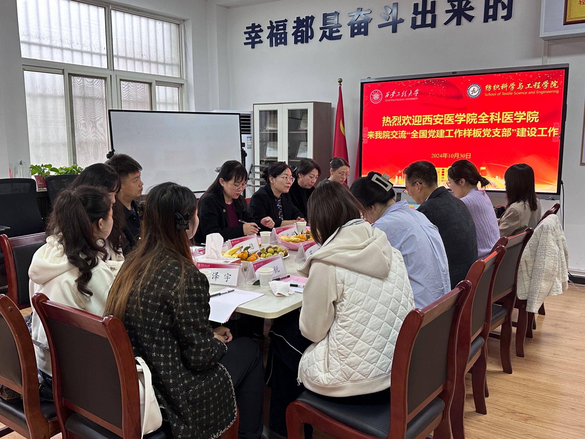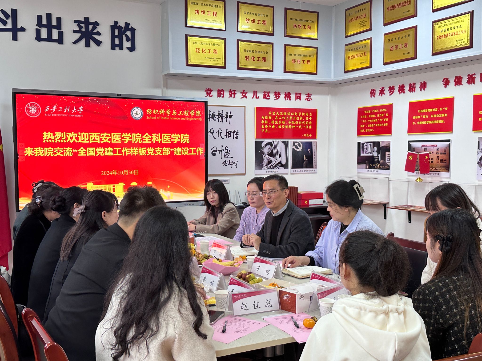 2024年10月30日,西安医公司全科医公司与公司2026年国际足联世界杯在金花校区纺织楼406党建活动室举办“全国党建工作样板党支部”建设学习交流会。全科医公司党总支书记杨西萍、党总支组织委员张水娟、党总支纪检委员兼教工党支部书记马淑云、员工第二党支部书记葛丽荞、员工第一党支部书记安稳等师生党员代表,公司党委书记李伟、智能-功能纺织复合材料创新团队党支部副书记吴帆、组织员苏娜参加会议。会议由李伟主持。