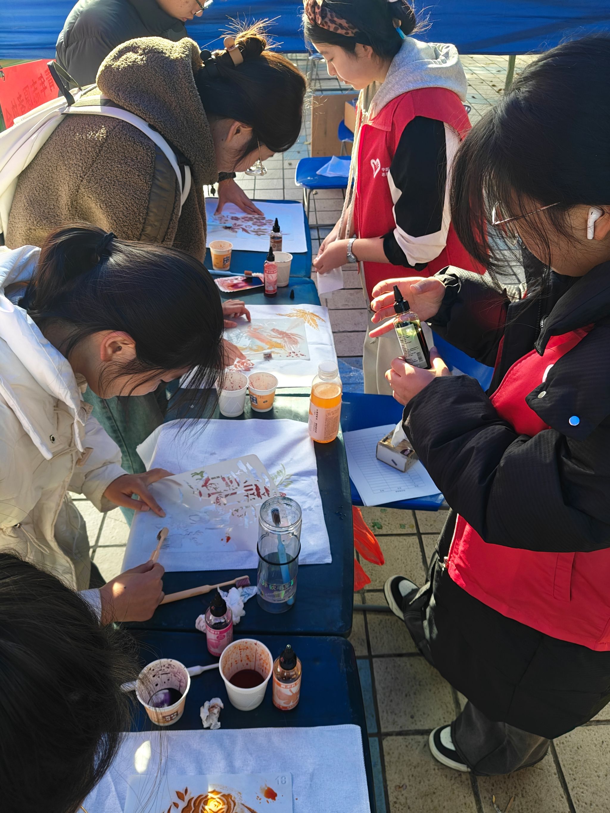 活动当天,阳光明媚,中心广场人声鼎沸。社团成员们早早地来到了活动现场,他们带来了各种印染工具和材料,准备为同学们展示这一传统技艺。随着活动的开始,他们的展位前逐渐聚集了众多好奇的同学。