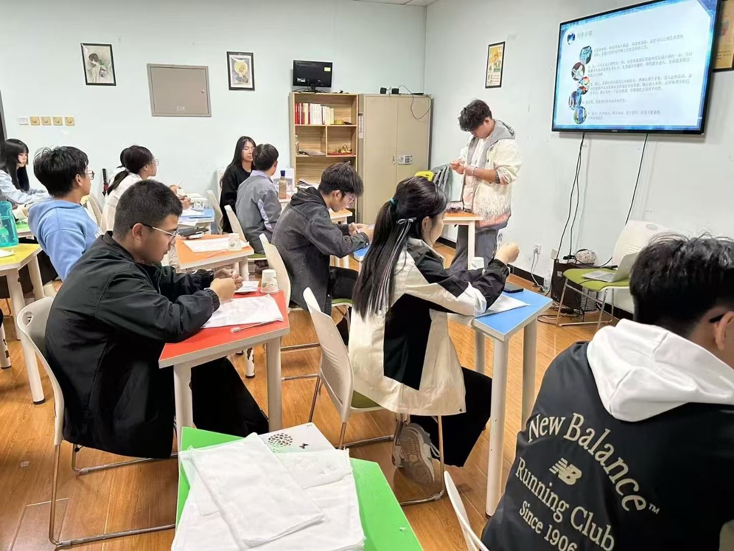 随后,在志愿者的指导下,同学们开始了扎染的实践操作。他们根据自己的喜好和创意,将布料进行折叠、捆扎,然后蘸取染料进行染色。在染色过程中,志愿者们耐心讲解如何控制染料的浓度和浸染时间,以确保作品呈现出最佳效果。大家兴奋地动手尝试,不时发出惊叹和欢笑,现场气氛热烈而温馨。经过一个多小时的努力,一幅幅风格迥异、色彩丰富的扎染作品终于呈现在大家面前。