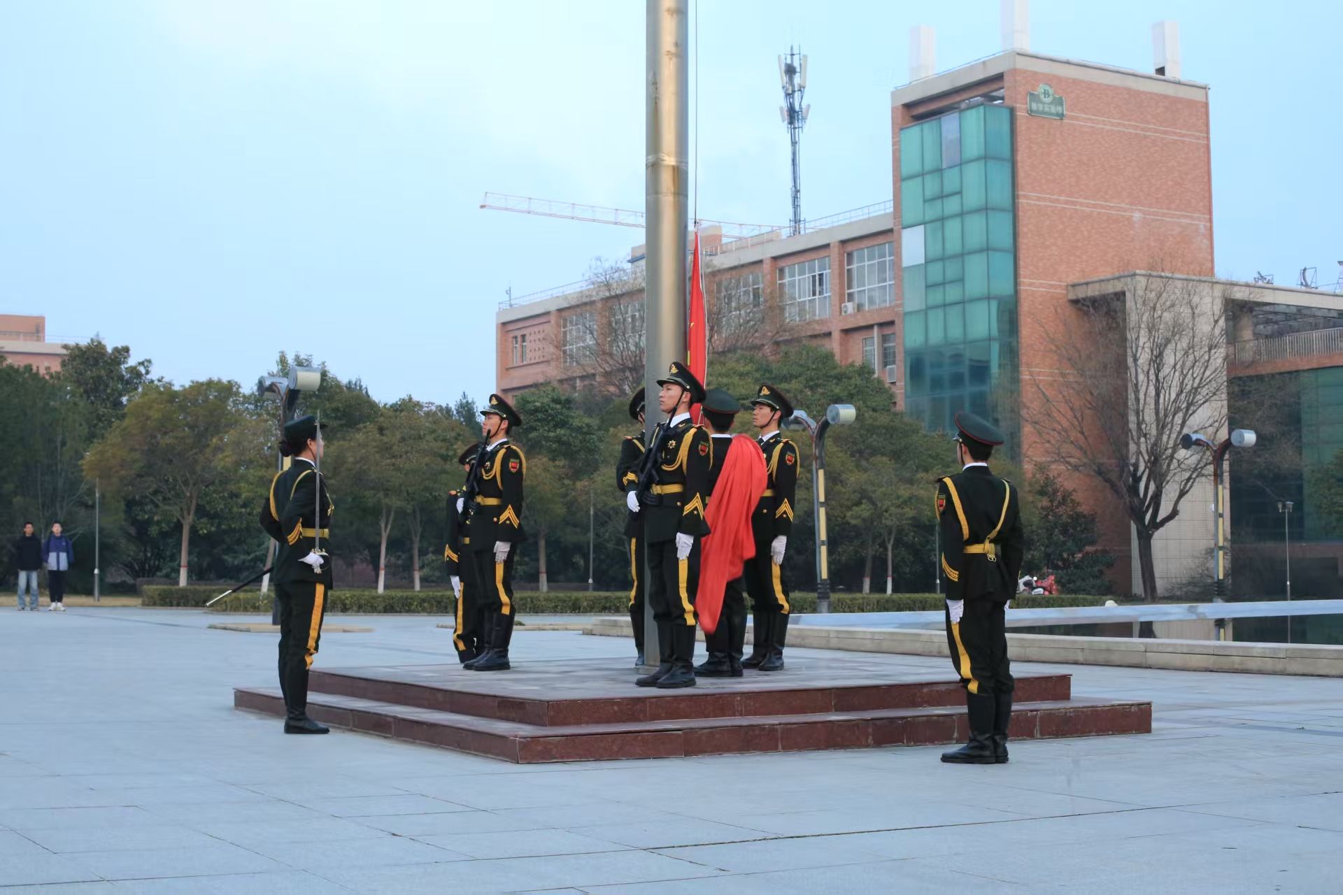 清晨7 点整,在全体同学的注目下,国旗护卫队的队员迈着整齐划一、铿锵有力的步伐,护送着五星红旗正步走向旗杆。随着激昂的国歌响起,旗手振臂一挥,五星红旗猎猎作响,与朝阳同辉,冉冉攀升至杆顶,正如我们冉冉升起的未来。