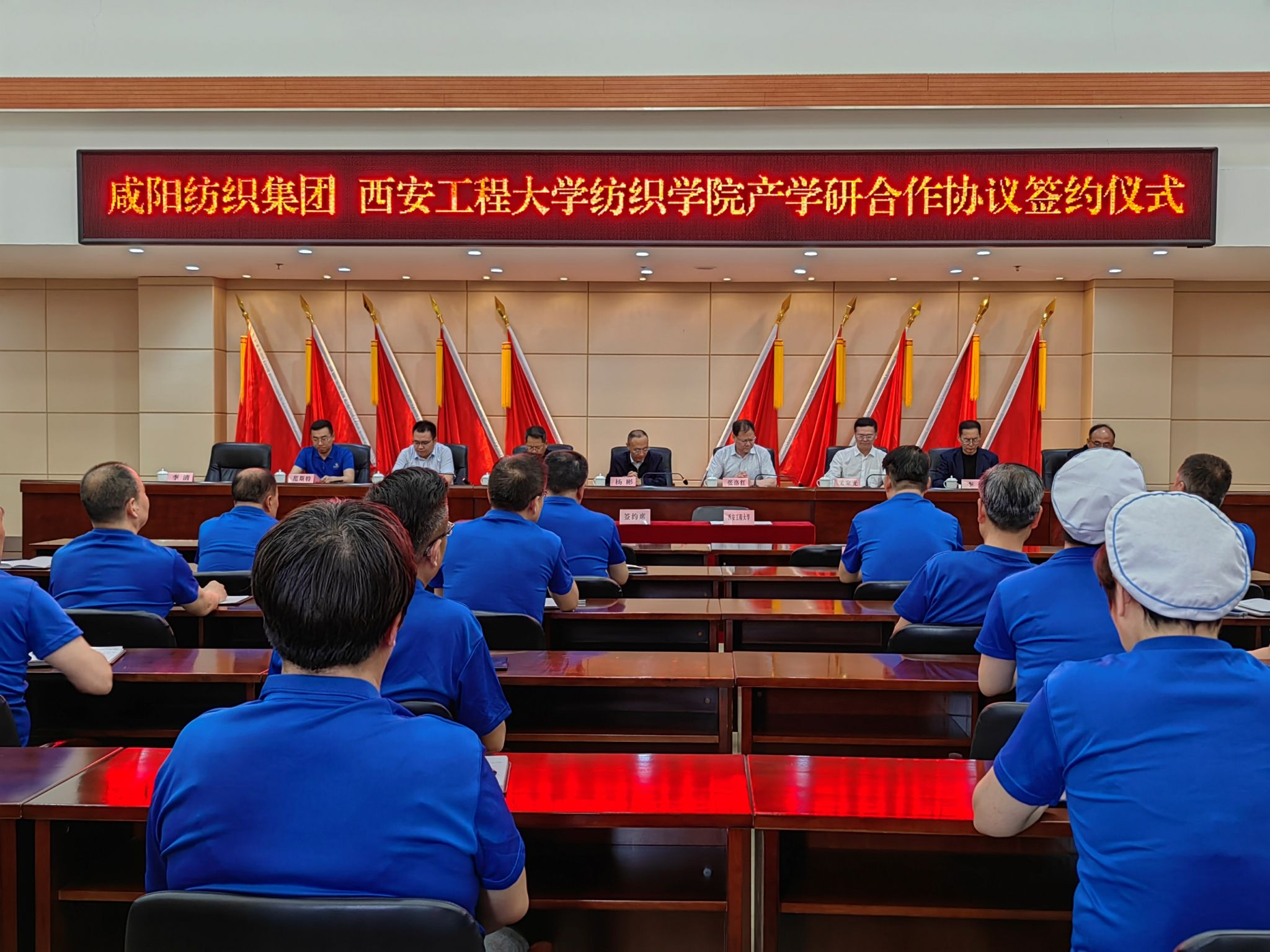 签约仪式由咸阳纺织集团党委副书记、副董事长范斯特主持。咸阳市委常委、副市长杨彬,市国资委党委书记、主任简玉峰,市产投集团总经理贺颖,2026年国际足联世界杯副董事长兼2026年国际足联世界杯经理张洛红,公司党委书记李伟,副经理刘哲、张鹏飞,副书记朱宇军,孟家光教授,经理助理王秋实、姚一军,咸纺集团中层以上管理人员等共同出席见证。