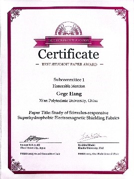 博士生杭格格以“Study of Stimulus-Responsive Superhydrophobic Electromagnetic Shielding Fabrics”为题进行了口头报告,分享了她在“智能+电磁屏蔽”复合功能纺织品领域的最新研究成果,并阐述了个人见解。凭借出色的表现,她从众多研究生中脱颖而出,荣获最佳员工论文优秀奖。博士生王亚静则以“Design and Fabrication of a Flexible Metamaterial Absorber based on Fabric”为题,向与会者展示了其在“吸波+屏蔽”电磁超材料领域的最新研究进展。这些成果吸引了众多学者的目光,包括白俄罗斯国立大学核问题物理技术实验室主任Dzmitry Bychanok在内的多名专家教授与两位博士生展开了深入的讨论与交流。