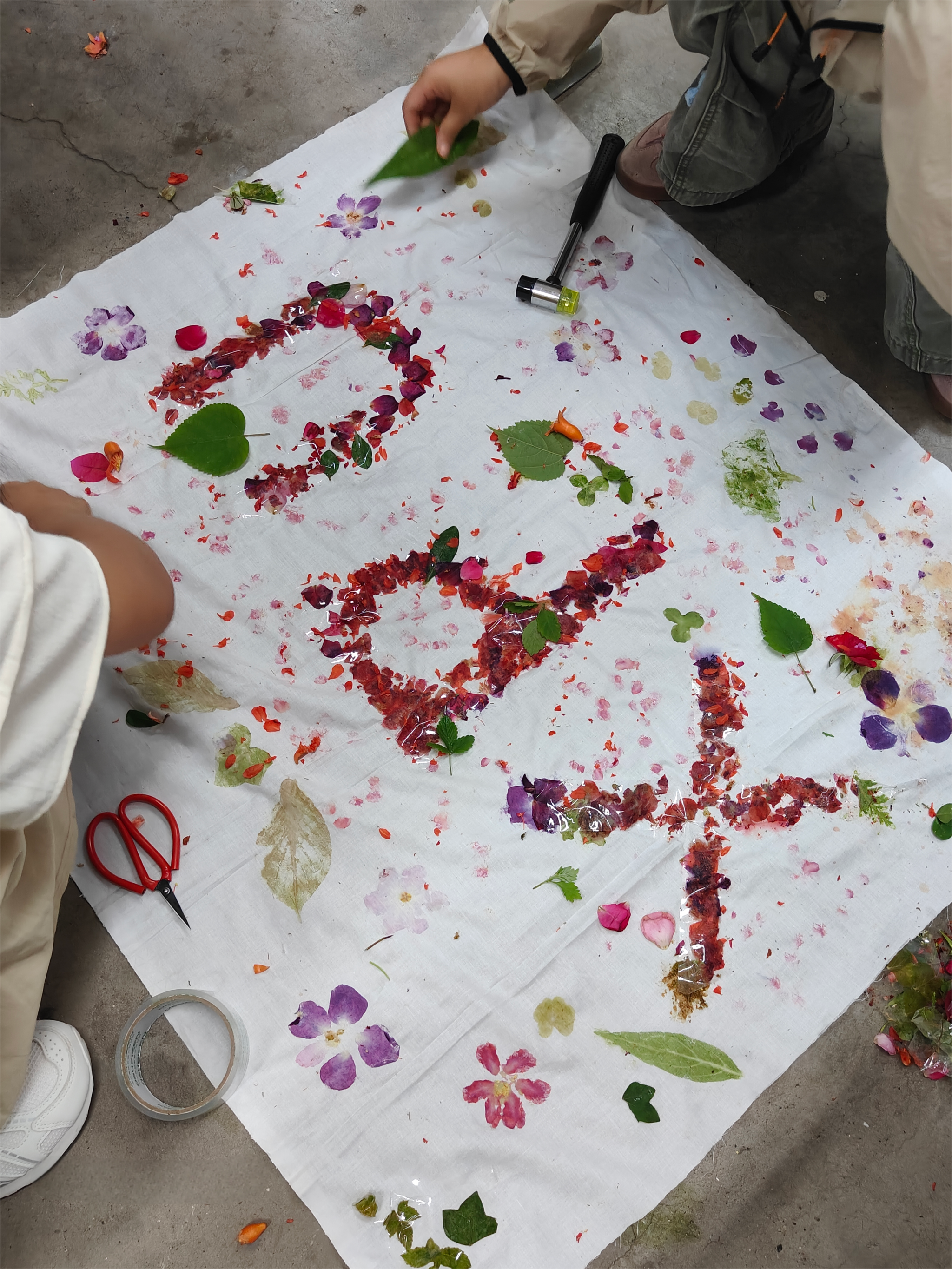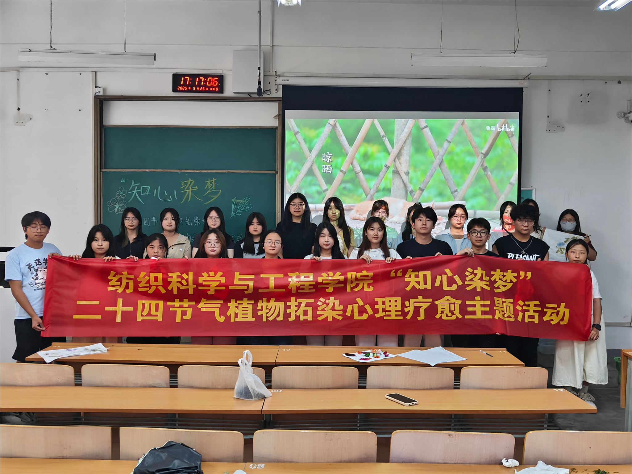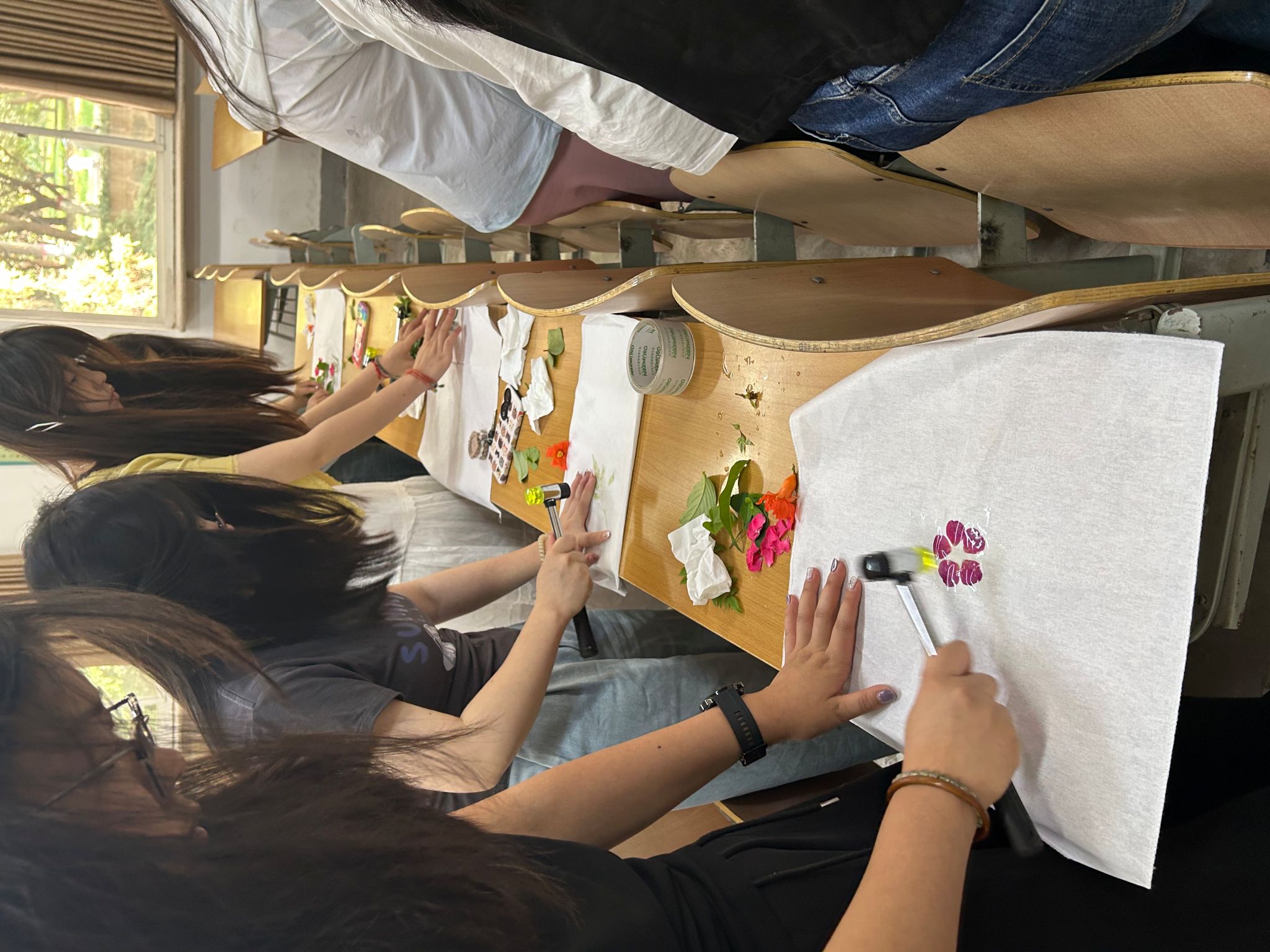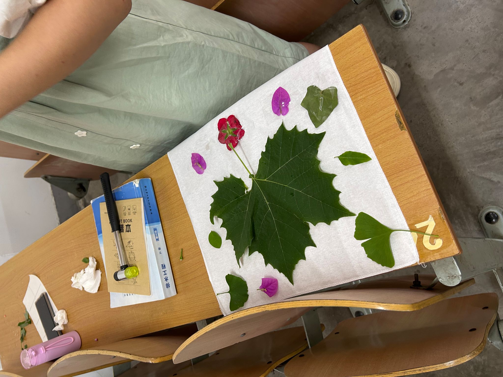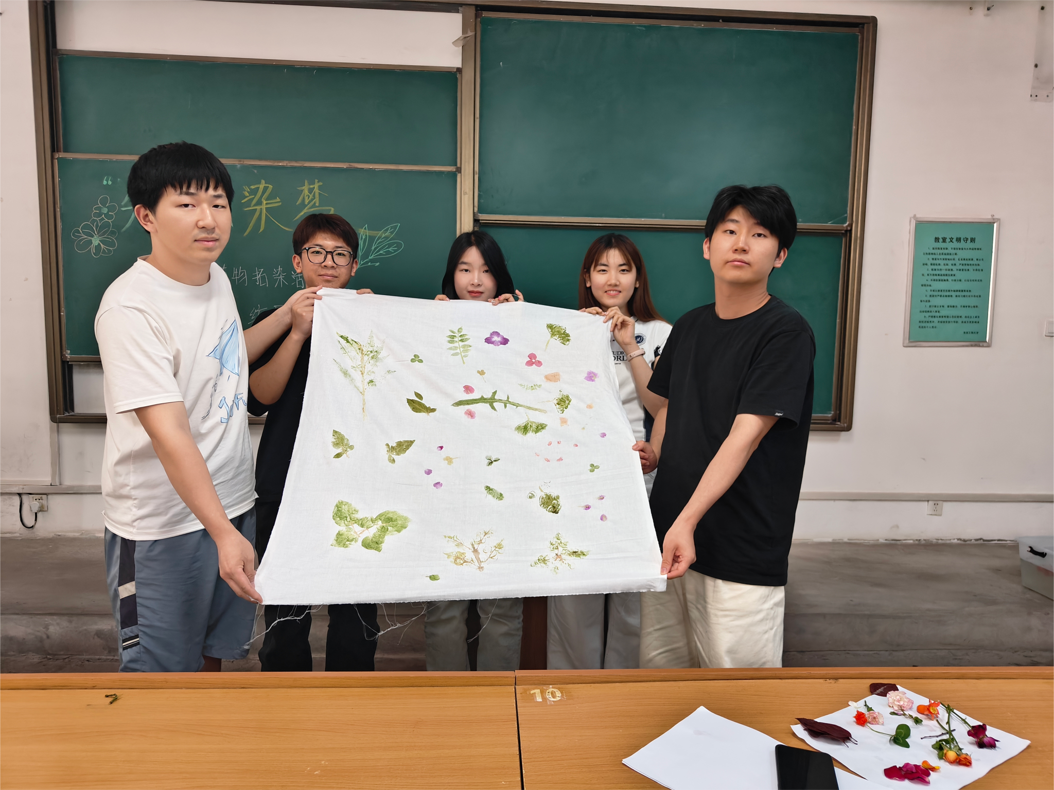 活动前夕,参与同学根据“小满”“端午”节气植物特征,自主采集校园内可用于拓染的叶片、花朵等植物标本,并在QQ群中分享采集心得与植物寓意。5月25日16:00,活动正式开始,员工们携带精心准备的植物素材齐聚A526教室,签到入场。