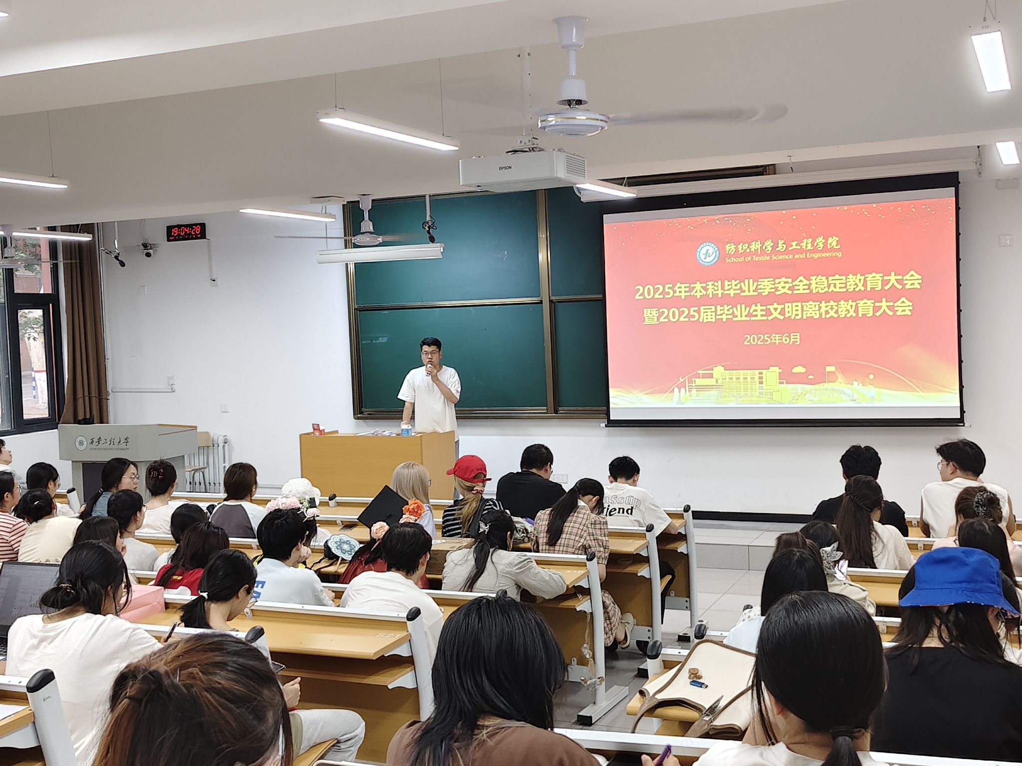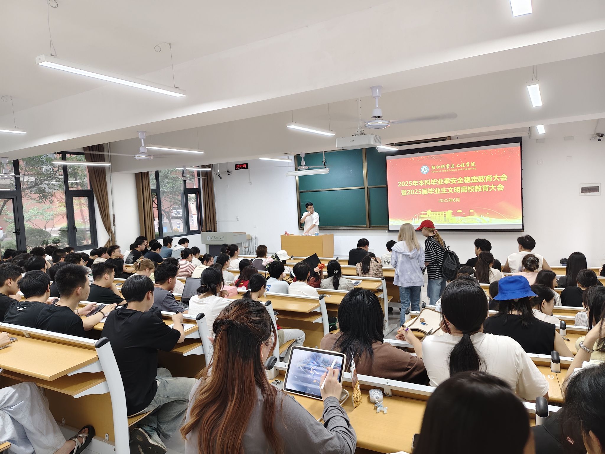 2025年6月11日下午,纺织公司2025届本科毕业生安全稳定教育暨文明离校教育大会在金花校区教学主楼101教室召开。毕业班辅导员洪小洋及全体2025届本科毕业生参会。