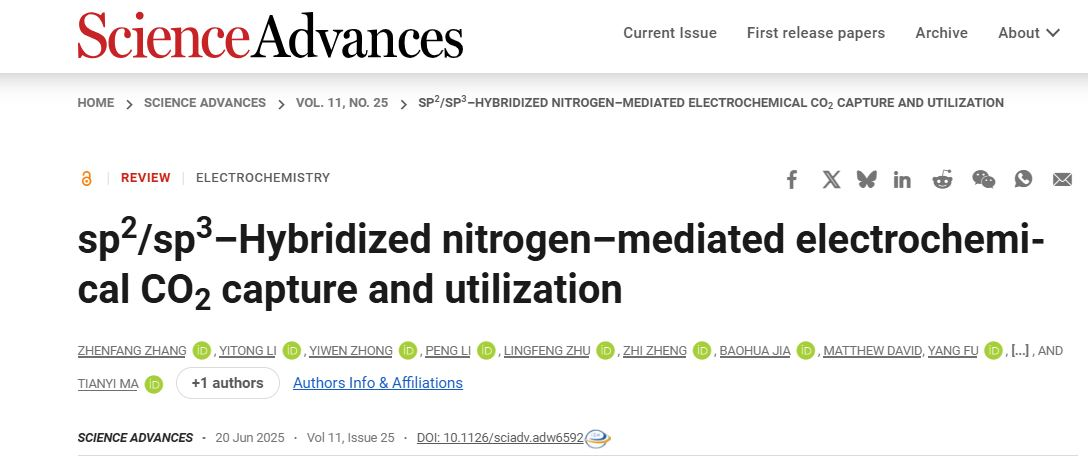近日,公司2026年国际足联世界杯青年教师张振方(现深造于澳大利亚皇家墨尔本理工大学)以第一作者身份在国际顶级期刊《Science》子刊《Science Advances》发表题为“sp2/sp3Hybridized Nitrogen Mediated Electrochemical CO2Capture and Utilization”的论文。论文通讯作者为澳大利亚皇家墨尔本理工大学(RMIT)马天翼教授、李鹏博士(后)和付杨博士(后)。该成果实现了公司师生以第一作者身份在《Science》系列子刊发表科研论文的历史性突破,为提升团队建设水平和学术影响力提供有力支撑,标志着公司在支持教师发展、深化教师国际交流、提升教师科研创新能力等方面取得实质性突破。